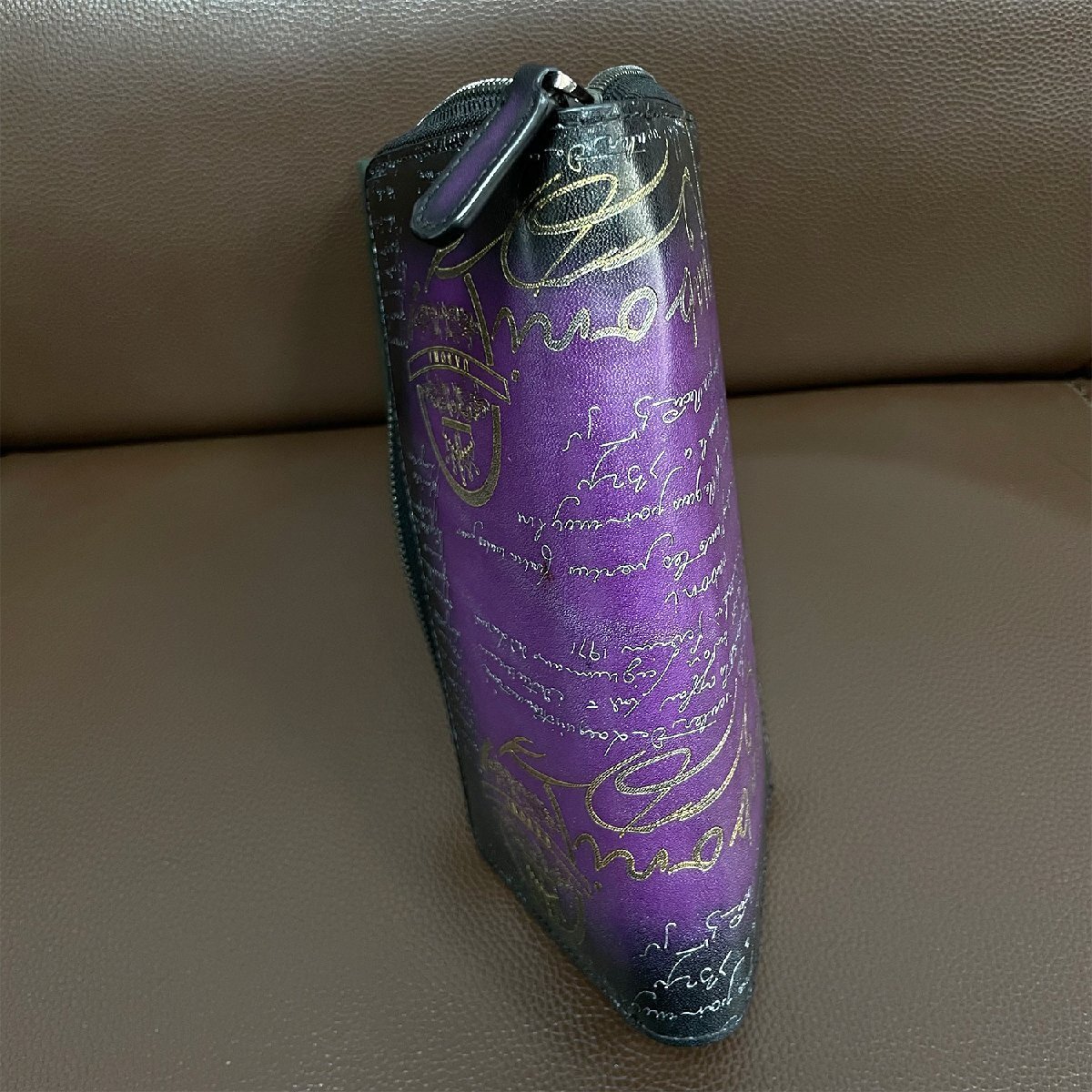 手触り感触が良くアンティーク風な財布と仕上がりました。角の部分は丸みを帯びた設計になっており、全体的にカリグラフィーとゴールデン/シルバーパティーヌがデザインされております。色艶、柔かさに優れていて高級感溢れる逸品となります。