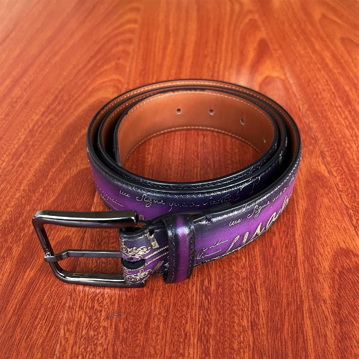 染料の開発成功は製作の一番重要な問題の解決に繋がり、職人が一つ一つの工程にこだわり作り上げた牛革ベルトです。一番こだわりの工程はカリグラフィーの彫り込みと革の着色です。