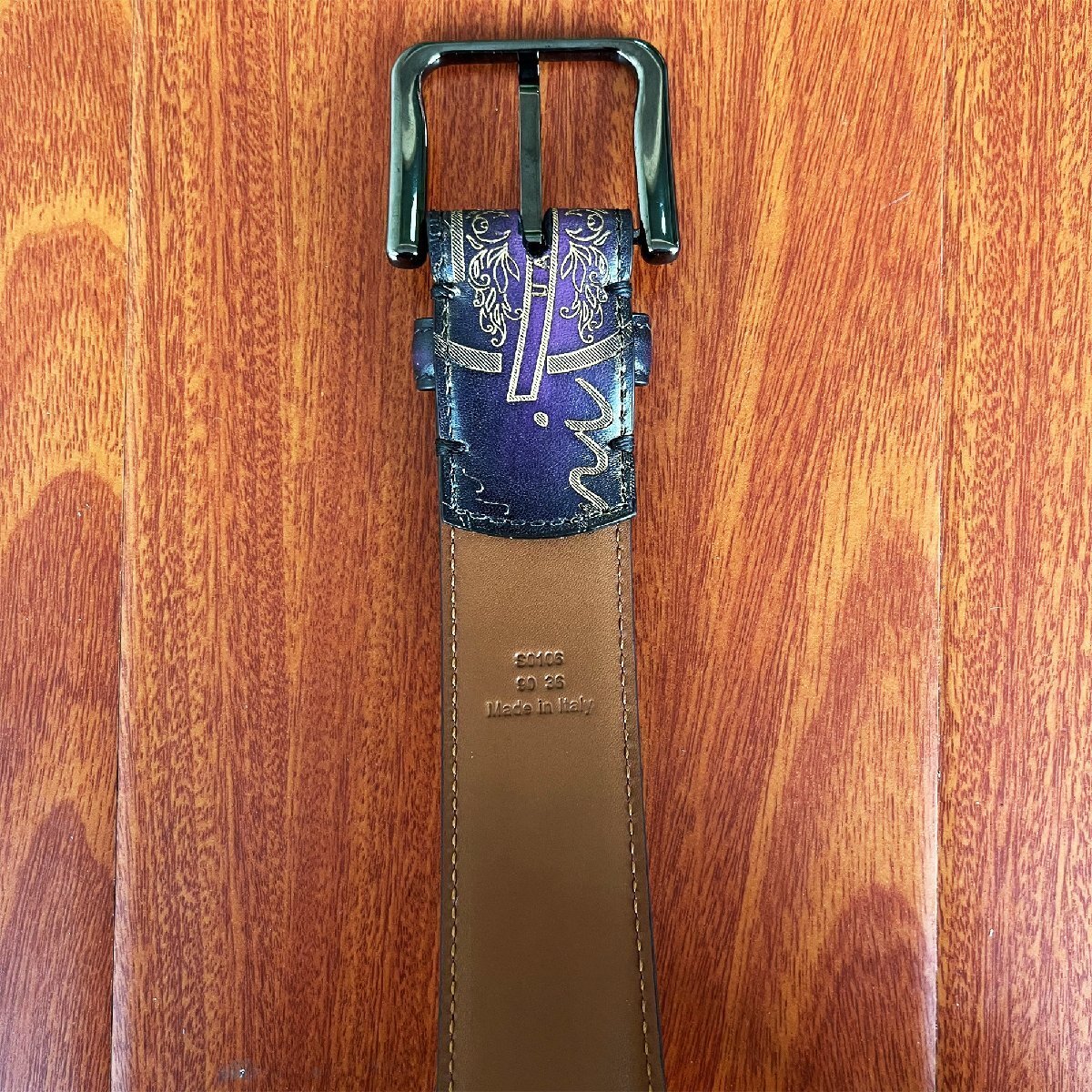 手触り感触が良くアンティーク風なベルトと仕上がりました。角の部分は丸みを帯びた設計になっており、全体的にカリグラフィーとゴールデン/シルバーパティーヌがデザインされております。色艶、柔かさに優れていて高級感溢れる逸品となります。