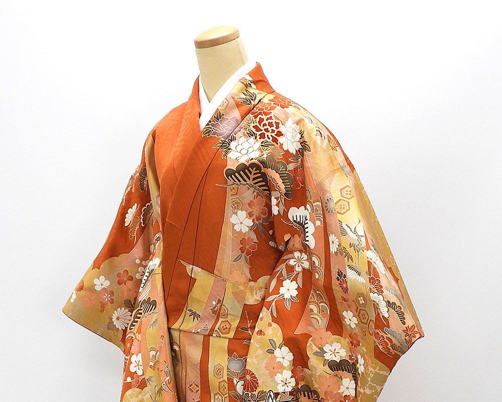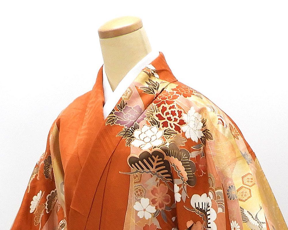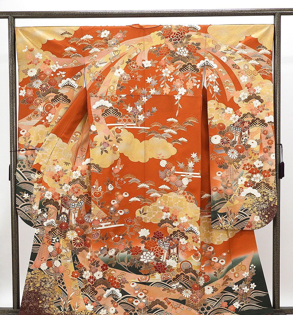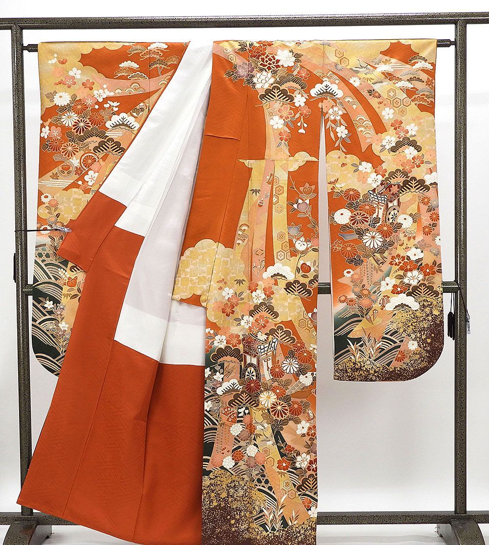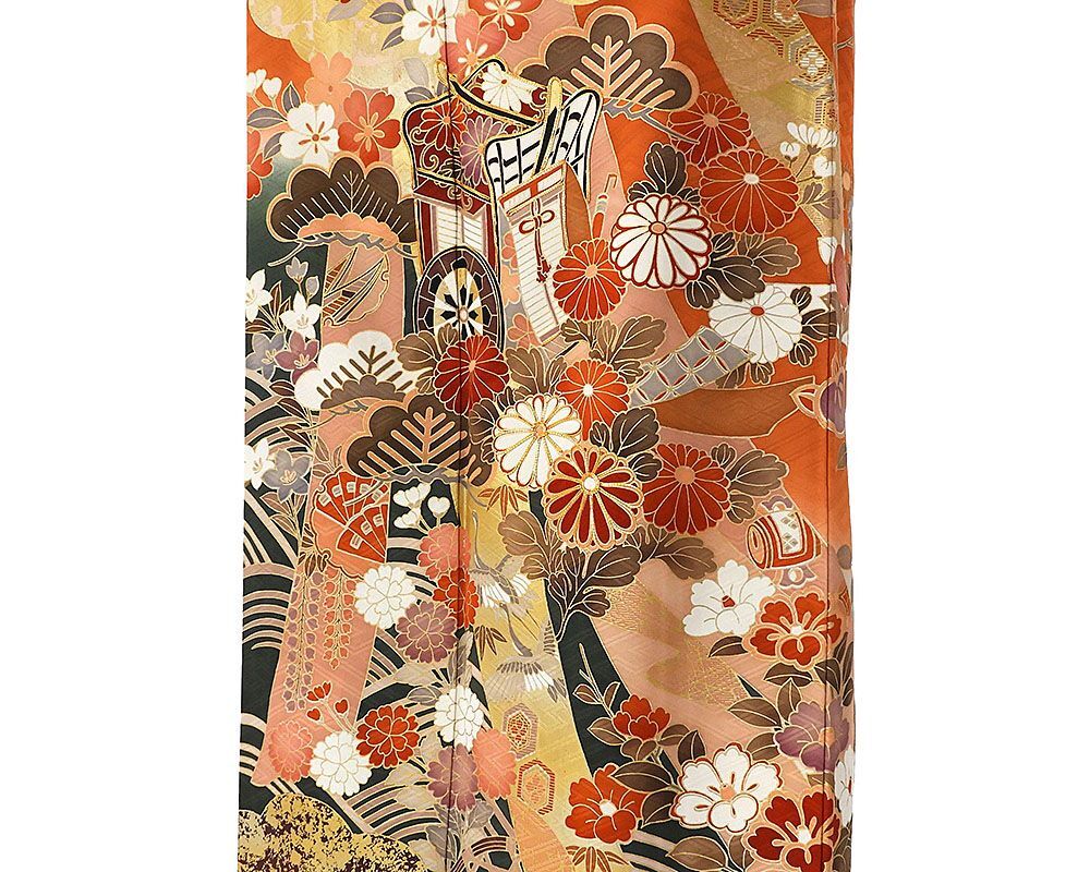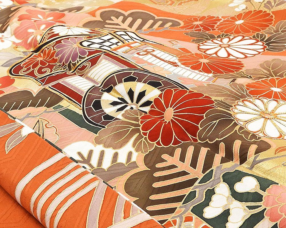 鞘型地紋の渋め柿色地に焦げ茶の裾ぼかしと深緑や赤・オフホワイトなどの多色と金箔・金駒刺繍で吉祥熨斗目御所車模様が柄付けされています。
