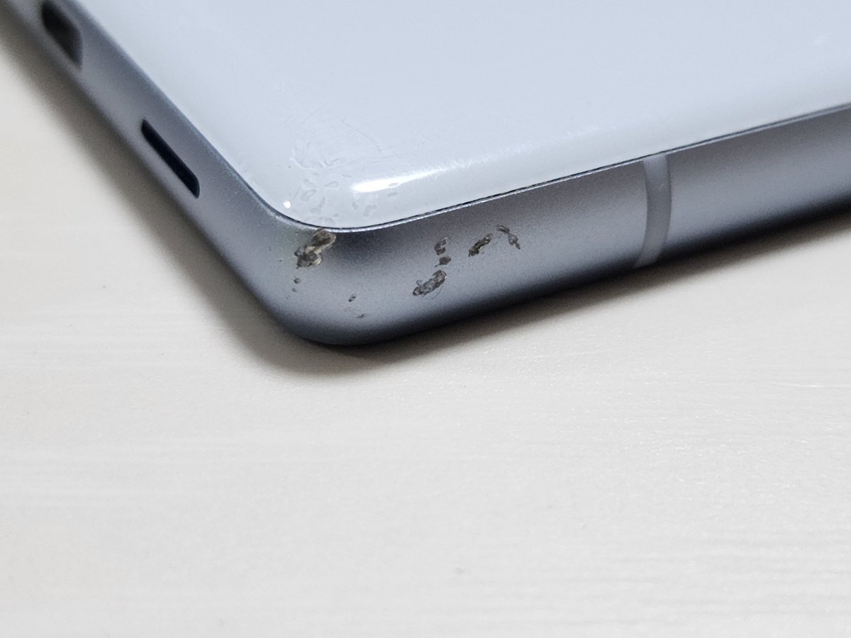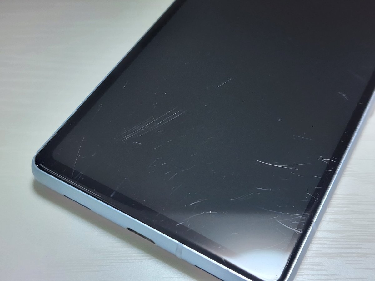 【外装状態】: C 画面には傷が多くついています。側面には打痕がいくつかあります。背面には傷やカバー痕が多いです。アウトカメラのレンズカバーに傷がいくつかありますが、カメラは正常です。