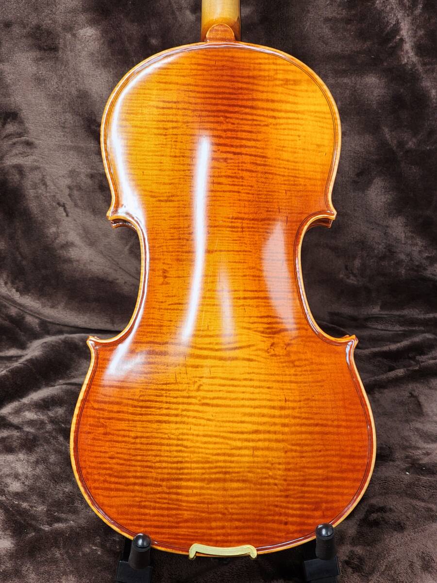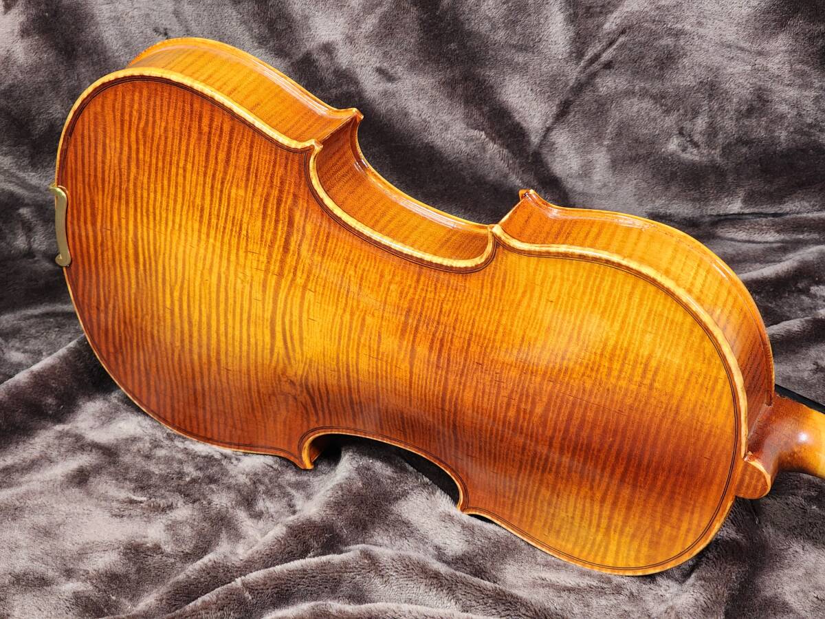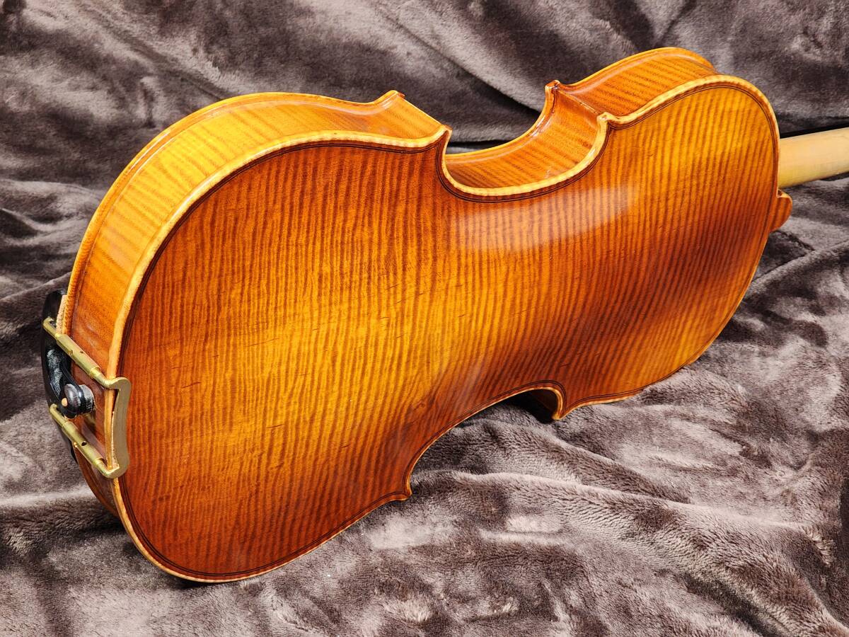 杢のあるメイプル材を使用した、裏板一枚仕上げの贅沢なバイオリンです