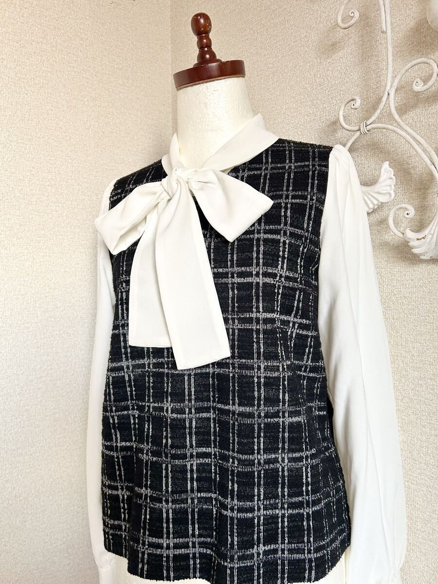 前身頃がツイード風になっている異素材ドッキングのお洒落なボウタイブラウスです。