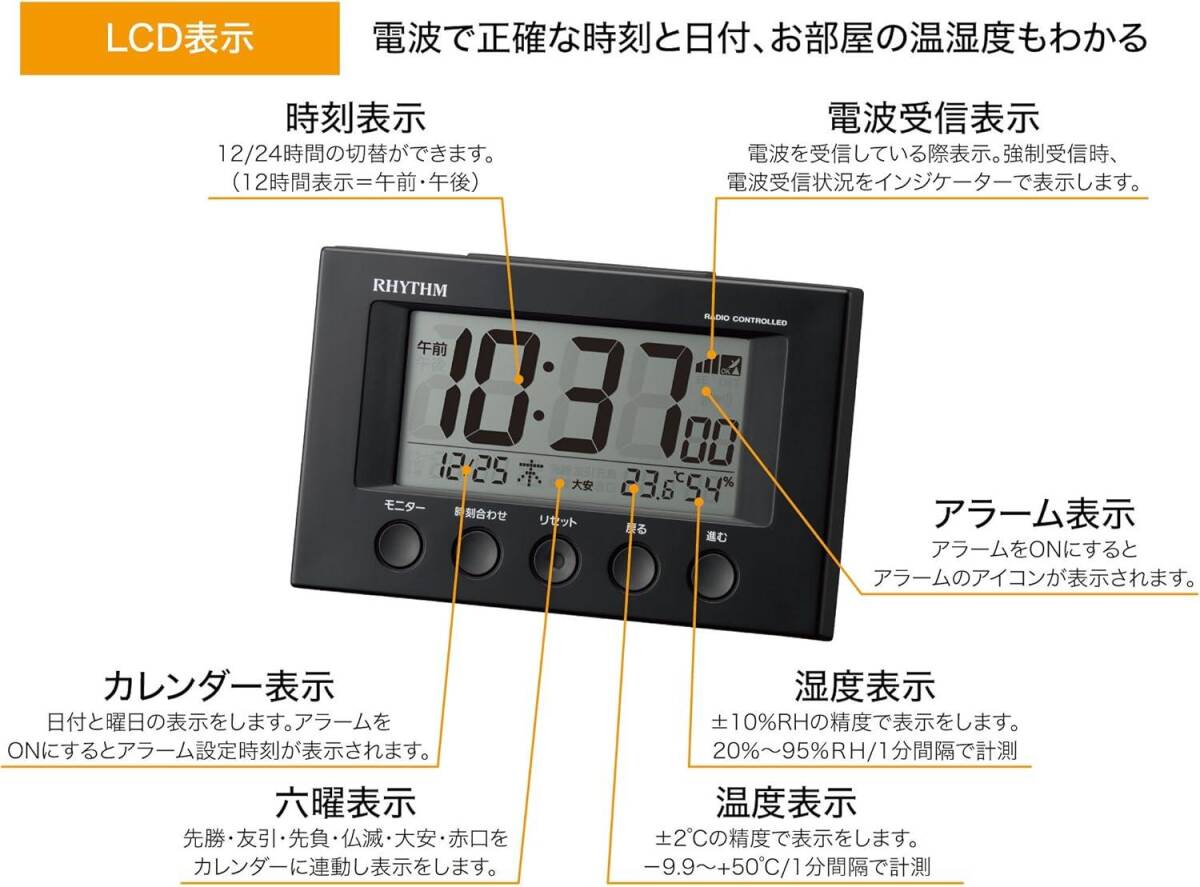 特徴 カレンダー表示, スヌーズ, 温度表示, 湿度表示, 目覚まし時計