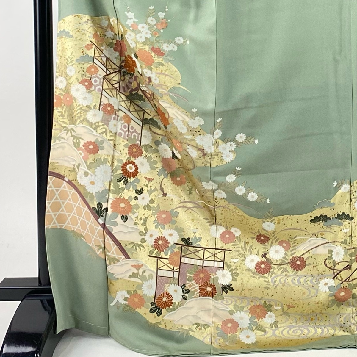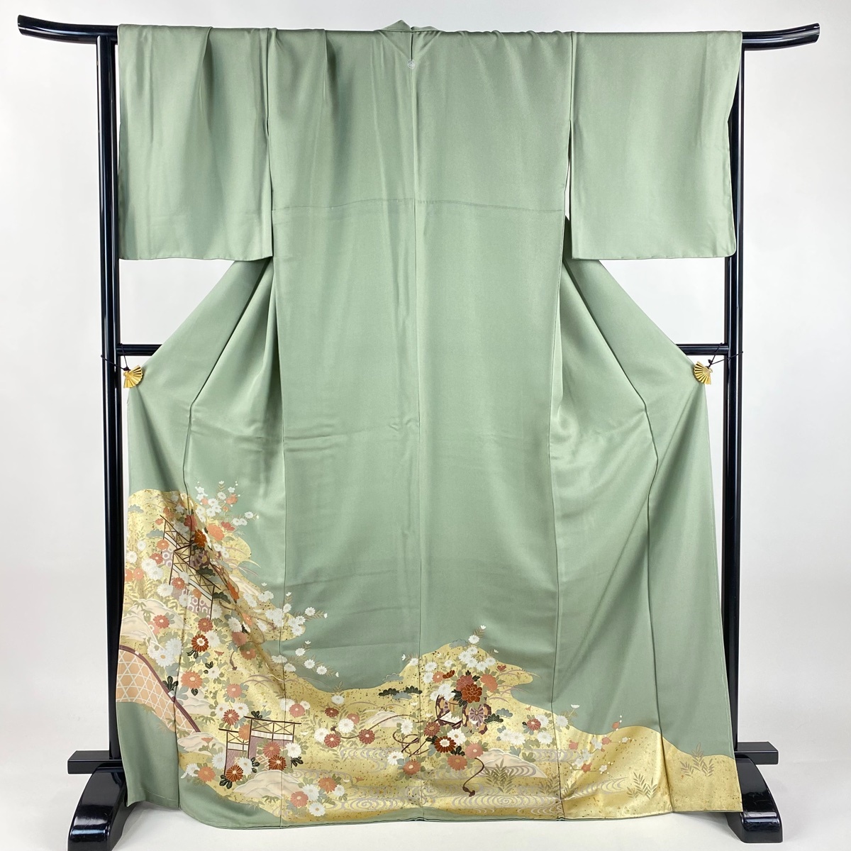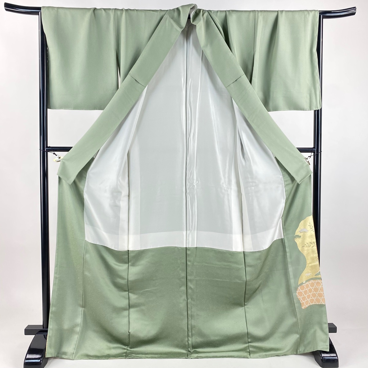 | 色留袖 秀品 花車 観世水 金糸 金彩 灰緑 袷 身丈172.5 裄丈70 L 正絹 【中古】 |