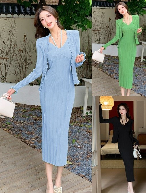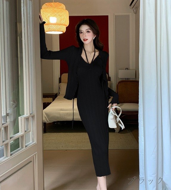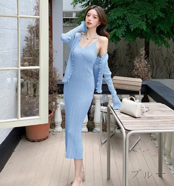 セットアップ ロングワンピース カーディガン 長袖 Vネック タイト シンプル カジュアル かわいい お出かけ レディース M ブルー
