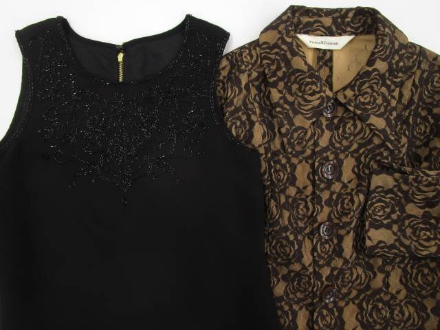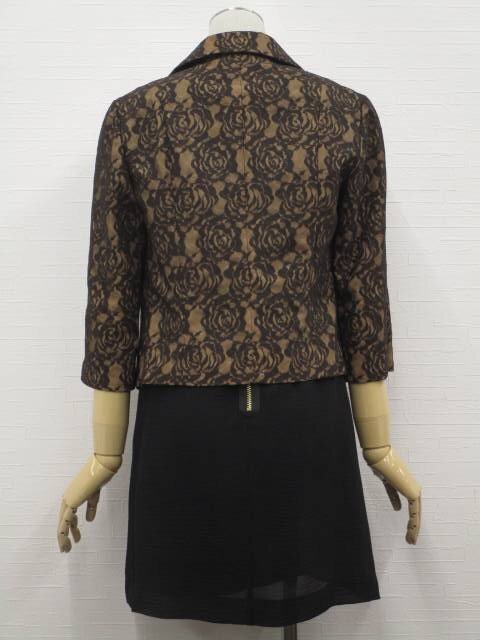 七分袖レースジャケット+ひざ丈シフォンノースリーブワンピース コーディネート2点セット M相当 ダークブラウン×ブラウン系 花柄/ブラック 花柄 きれいめ系 20代・30代・40代