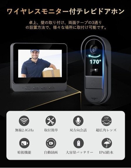 インターホン ワイヤレス ドアホン カメラ付き モニター付き テレビドアホン 工事不要 双方向通話 録画 暗視ドアホン (A178)