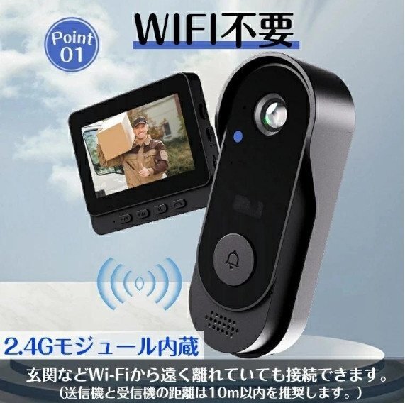 ワイヤレスインターホン子機とモニター親機はペアリング済みなので、配線工事やネットワーク設定が不要で、取付簡単なワイヤレステレビドアホンです。約95mm×54mmの4.3型のワイドカラー大型液晶ディスプレイと170度超広角レンズが搭載されており、撮影範囲が広く、来訪者はもちろん、複数人の来客でも周囲の状況もしっかりと視認できます。双方向通話機能を使ってコミュニケーションが取れますので来訪者の姿を確認しながら会話が可能。