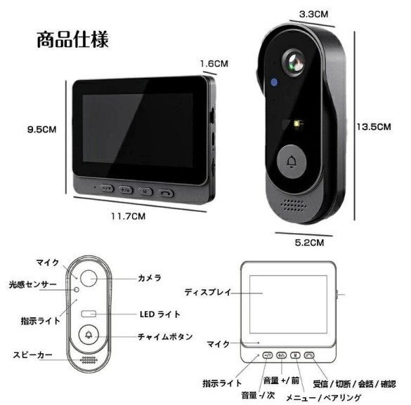 ドアカメラに取付枠が装着されており、IP65の防水性能を持ち、屋外での使用や雨天時でも安心して使えるワイヤレスドアホンです。