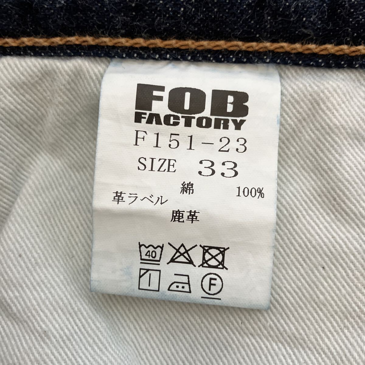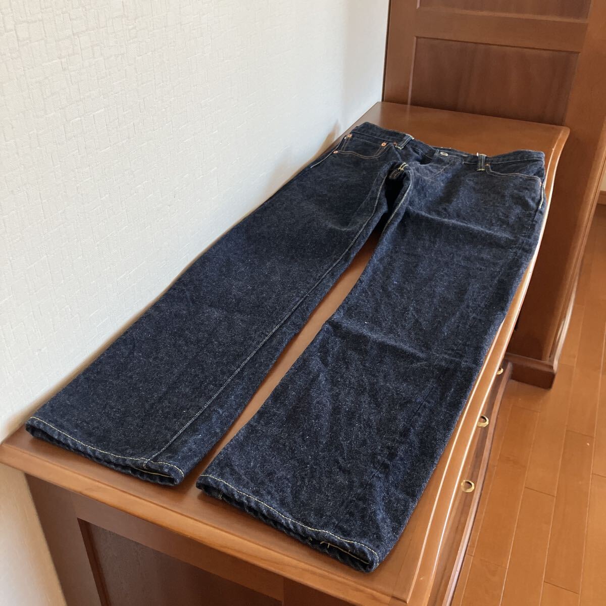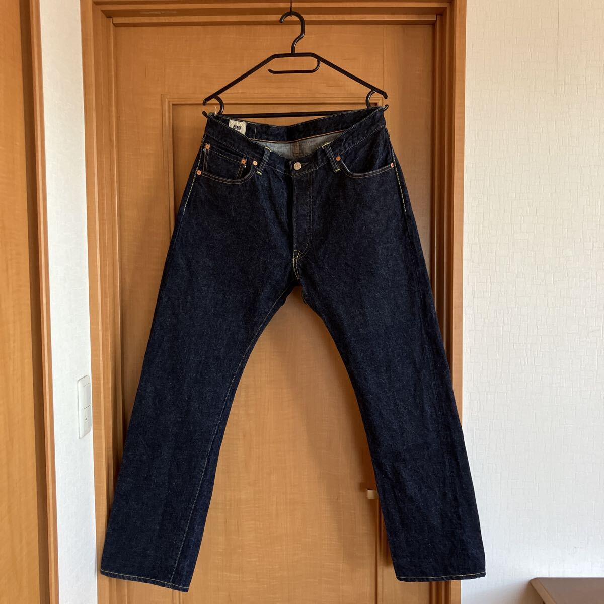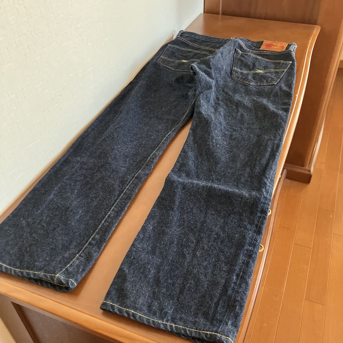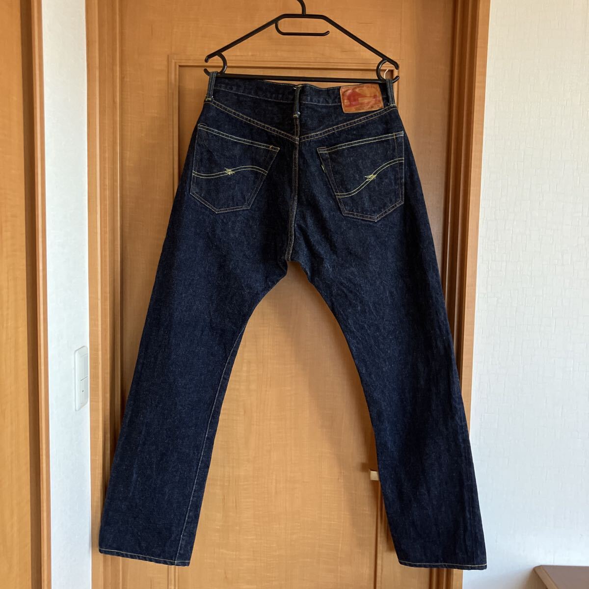 フロントボタンフライ、サイドシーム、コインポケットセルビッチ、裾チェーンステッチ、レザーパッチ鹿革、バックポケット隠しリベット、打ち抜きリベット、オレンジとイエローの2色ステッチ。