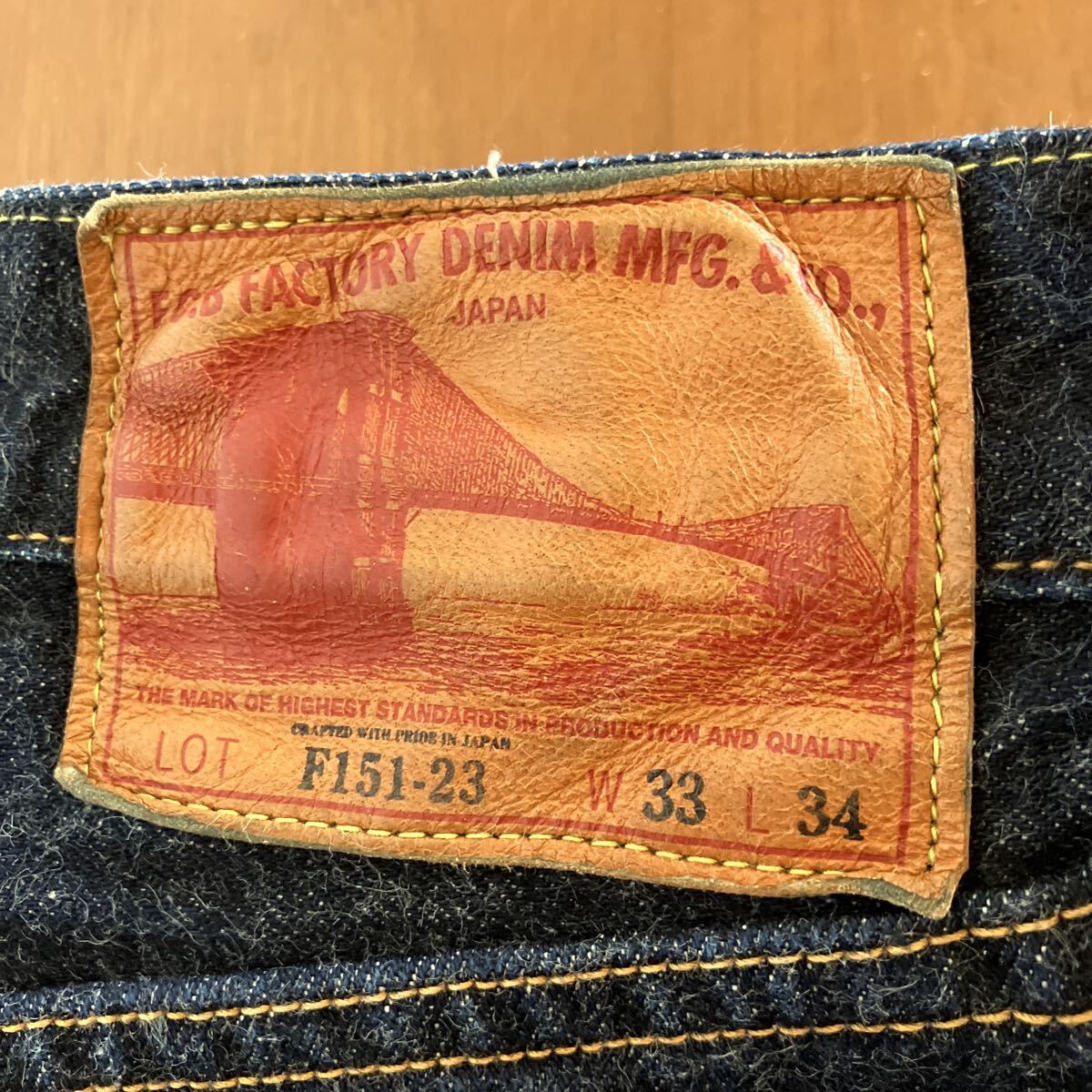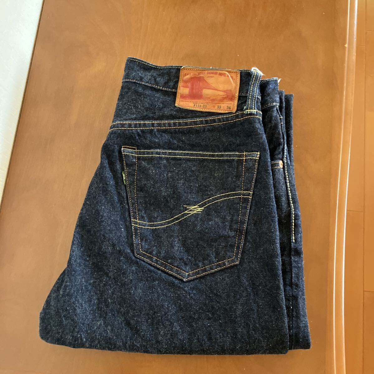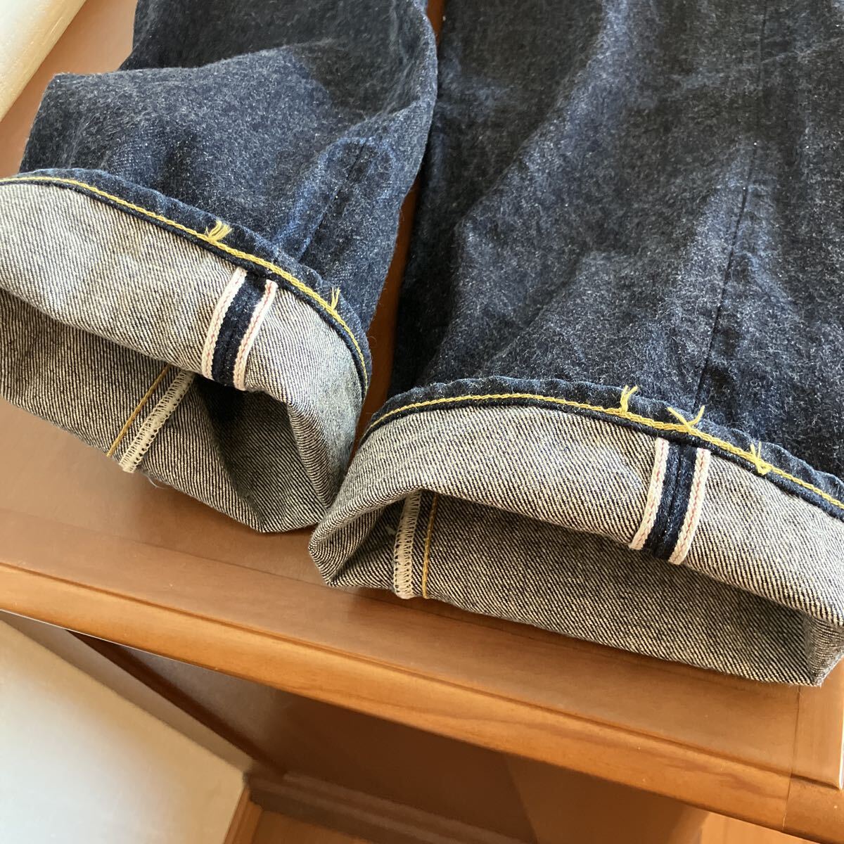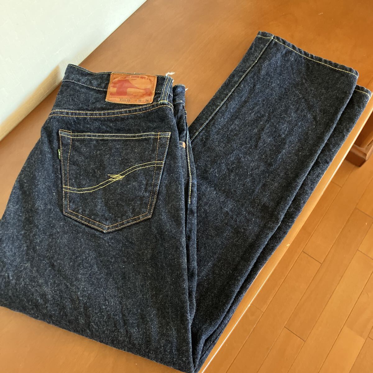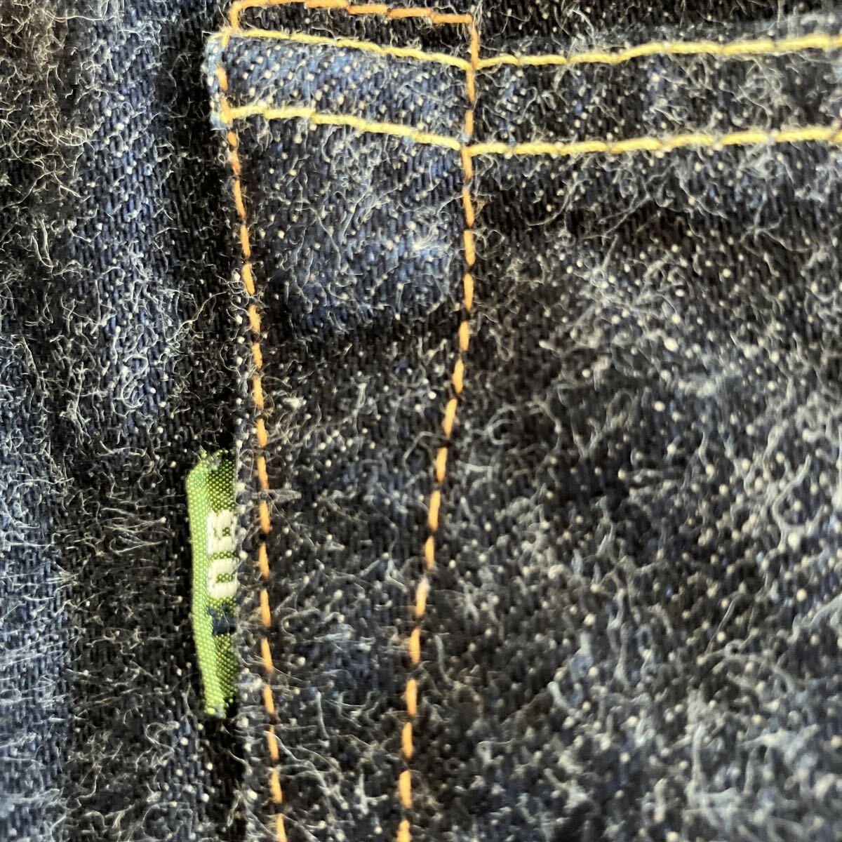フロントボタンフライ、サイドシーム、コインポケットセルビッチ、裾チェーンステッチ、レザーパッチ鹿革、バックポケット隠しリベット、打ち抜きリベット、オレンジとイエローの2色ステッチ。
