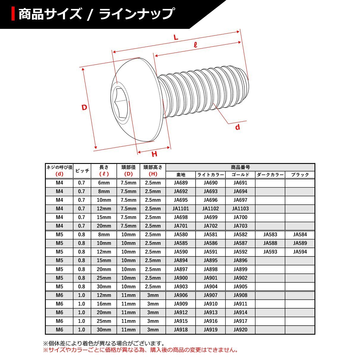 | 64チタン トラスヘッド ボタンボルト 数量:1個売り 材質:64チタン 頭部形状:六角穴付き 適合工具:レンチなど 商品サイズ:M4×8mm P0.7(詳細は画像に掲載) ネジの長さ:8mm(告知なしで変更の時あり、詳細のサイズが必要な場合は要問い合わせ。ロットにより全ネジ、半ネジが異なりますが、選ぶことができません。) 適合車種:汎用タイプ。サイズ等でご判断ください。なお、適合車種に関しての回答は致しておりません。 商品カラー:焼きチタンカラー、虹色 ※サイズやカラーごとに価格が異なる為、購入後の商品の変更はできません。 また、ご購入数しかお取引ができません。 数量以上ご必要の場合は、ご入札前にご質問ください。 在庫がございましたら別途出品させていただきます。 |