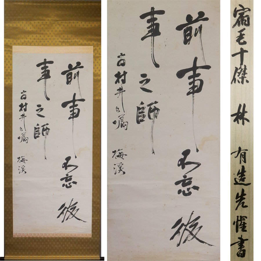 ■商品説明 この品は、代々続く、然る旧家からの初心だしの品であり、 大切にしてきた品だそうです。 下記、明治期の政界を牽引し、 後年は地元である高知県宿毛市の発展の為に尽力した、 林有造氏による知人の為に書かれた二行書 「前事不忘後事之師」を軸装に仕立てた大変貴重な作品です。 【 前事不忘後事之師(ぜんじをわすれざるはこうじのしなり) 】 「史記」秦始皇本紀に書かれていた言葉のひとつ。 以前に起こったことや行なったことを忘れなければ、 これからの参考になるし、手本にもなり得る。 《 林有造(はやし ゆうぞう) 》 1842~1921年 政治家。 天保13(1842)年、岩村英俊の二男として宿毛で生まれ、林茂次平の養子となる。 明治維新後、初代高知県知事を務める。号は、梅渓。 板垣退助らと立志社を創立。西南戦争では武器購入に奔走したが、発覚して投獄。 出獄後の明治22年(1889年)に林邸を建設し、 高知県幡多地域の自由民権運動の拠点として政治家や支援者の集いの場とし、 国会開設後、衆議院議員、逓相・農商務相を歴任。 自由党・政友会に所属。 明治41年(1908年)、66オで政界を引退した後は、 宿毛に戻り、「私は、宿毛の人達の為に政界を引退して帰ってきた」との宣言のとおり、 真円真珠の養殖や新田開発、片島港開発などの地域振興事業を進め、 大正10(1921)年に79歳で息を引き取るまで、郷里の発展に寄与。 ■紙本・肉筆 ■状 態 時代なりのヤケ・オレ・薄シミ等あり。 ■寸 法 軸寸法/約198.0cm×約73.5cm。 本紙寸法/約137.0cm×約60.5cm。 ■落 款 御覧の様な銘等あり。 ■箱 なし・紙箱。 【即決・送料無料】の表示商品に限り、 一部地域(北海道・沖縄)を除き、送料無料キャンペーンを実施しております。 ご希望の方は、お早めに入札して頂けます様、宜しくお願い致します。 【※※なお、作品に対して疑問や質問がある場合には、※※】 質問欄もしくは、ストア情報に当方の情報が記載されておりますので、こちらをクリックしてお問い合わせ下さい。 宜しくお願い致します。 |