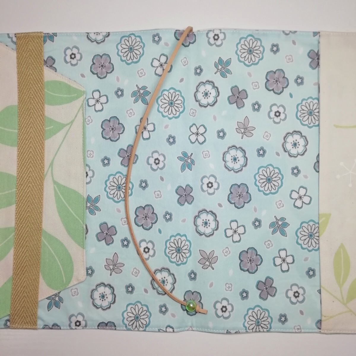 こちらはハンドメイドのブックカバーです。サイズはA5判(14.8cm ×21cm)用で、広げた状態で、縦約22、横約41です。