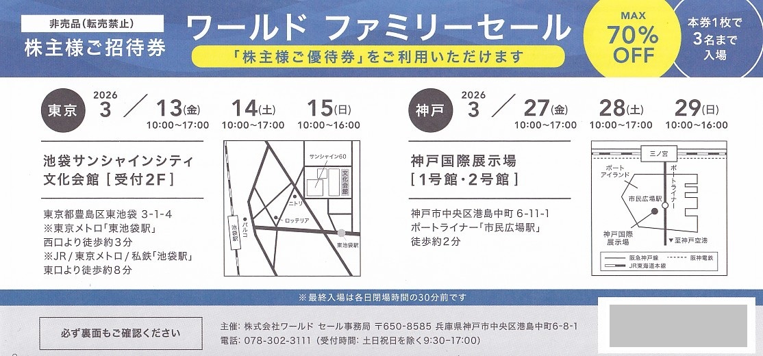 ご覧頂きありがとうございます。 商品掲載内容未確認によるトラブル防止のため、必ず最後まで掲載内容をお読み頂き、商品掲載内容にご同意の上、ご入札下さい。 ★最新 ワールド株主様ご招待券 ワールドファミリーセールご招待券★送料無料条件有★です。 入札は、ワールド株主様ご招待券ワールドファミリーセールご招待券1枚当たりの金額でお願いいたします。 ◇◆商品説明◆◇ ★本券1枚につき、3名様までご入場頂けます。(中学生未満のお子様は招待券不要です。)ファミリーセール会場では、ワールド株主様ご優待券をご利用頂けます。最大割引率70%OFFとなります。 ★本券は回収されませんので、再入場にご利用ください。 ★東京:2026年3月13、14、15日池袋サンシャインシティ文化会館 ★神戸:2026年3月27、28、29日神戸国際展示場1号館、2号館 ◇◆発送方法と送料について◆◇ ★送料は、落札者様のご負担でお願いいたします。基本発送は、普通郵便(定形郵便)にて発送させて頂きます。 但し、郵便事故による不着、あるいは郵送中の損害による返金、あるいは代替商品補償の責任は負いかねますのであらかじめご了承下さい。 ご不安な場合には、追跡記録可能または損害補償対象の発送方法をお奨めいたします。なお、郵便事故が発生した場合には、出来る限りのご協力はさせて頂きます。 また、郵便配達サービス変更に伴い、土曜日配達の中止、お届け日数の繰り下げが実施されています。普通郵便・特定記録郵便の場合、到着まで時間を要する場合がございます。 あらかじめご了承頂くとともに余裕をもったご対応を頂きますようにお願いいたします。 ●普通郵便(定形郵便)は110円(発送重量50gまで)(損害補償対象外)(土曜日・日曜日・休日配達中止) ●特定記録郵便は、普通郵便(定形郵便)+210円(追跡記録可能)(損害補償対象外)(土曜日・日曜日・休日配達中止) ●速達郵便は、普通郵便(定形郵便)+300円(損害補償対象外)(土曜日・日曜日・休日配達実施) ●書留郵便は、普通郵便(定形郵便)+480円(追跡記録可能)(損害補償対象)(土曜日・日曜日・休日配達実施) ●簡易書留郵便は、普通郵便(定形郵便)+350円(追跡記録可能)(損害補償対象)(土曜日・日曜日・休日配達実施) ●レターパックプラスは600円・レターパックライトは430円(追跡記録可能)(損害補償対象外)(土曜日・日曜日・休日配達実施) ●スマートレターは210円(損害補償対象外)(土曜日・日曜日・休日配達中止) ★発送方法については、普通郵便(定形郵便)・特定記録郵便・速達郵便・簡易書留郵便・書留郵便・ゆうパック(損害補償対象)(土曜日・日曜日・休日配達実施)・ クロネコ宅急便(損害補償対象)・レターパック(プラス・ライト)・スマートレター等、落札者様のご希望発送方法に対応いたします。 但し、ミニレター(郵便書簡)、クリックポストについては対応いたしかねますのであらかじめご了承ください。 ★即決価格でご落札された場合には、普通郵便(定形郵便)に限り出品者が送料を負担いたします。 また、即決価格の90%以上でご落札された場合には、普通郵便(定形郵便)に限り出品者が送料の50%を負担いたします。 但し、即決価格、あるいは即決価格の90%以上でご落札された商品を普通郵便(定形郵便)以外の発送方法でご希望される場合、送料は落札者様全額ご負担とさせて頂きます。 あらかじめご了承下さい。 なお、即決価格、あるいは即決価格の90%以上でご落札された商品と同梱発送をご希望される場合、送料は落札者様全額ご負担とさせて頂きます。あらかじめご了承下さい。 ◇◆備考・その他◆◇ ●誠実、迅速に対応いたしますので、よろしくお願いいたします。 ●自己紹介欄もどうぞご覧下さい。 ●他にも多数出品しておりますのでどうぞご覧下さい。 ●ご落札から48時間以内に落札者様情報のご連絡を必ずお願いいたします。 ご連絡を頂けない場合には、お取引の意思がないと判断させていただき、落札者様のご都合により即キャンセルとさせて頂きます。十分にご留意下さい。 また、落札者様情報のご連絡があるまでは、取引メッセージによるご質問等には一切ご回答いたしかねますのであらかじめご了承下さい。 ●落札者様情報のご連絡を頂いた後、落札者様から何もご連絡がなく、ご落札から72時間以内にご決済頂けない場合には、 落札者様のご都合により即キャンセルとさせて頂きます。十分にご留意下さい。 また、落札者様からご連絡があった場合でも、かんたん決済支払期限を超過した場合は、落札者様のご都合により即キャンセルとさせて頂きます。 なお、この場合、出品者にて商品を削除させて頂く際、落札者様の評価に対して「非常に悪い」を付けさせて頂きます。ご了承の上、十分にご留意下さい。 なお、この場合には、出品者への評価は一切不要です。ご遠慮下さい。但し、落札者様から、その他のお支払い方法をご提示頂いた場合にはその限りではありません。 但し、その他のお支払い方法のご提示は、かんたん決