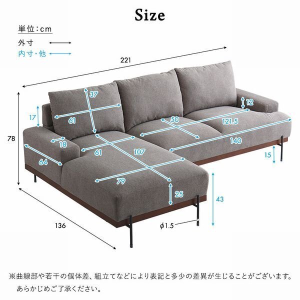 | 【カラー】 ベージュ、グレー 【サイズ】 W221×D136×H78cm(SH43cm) 【重量】 73.4kg 【素材】 張材;ポリエステル100% クッション材:ウレタンフォーム、鋼製バネ 構造部分:天然木 脚部:金属(スチール) 【梱包】2梱包でお届けします。 2-1 サイズ:W140×D79×H36cm 2-2 サイズ:W142×D80×H36cm 重量:2個口合計 77.5kg 【組み立て品】 お客様による組み立てが必要です。 【ご注意】 ・サイズ、重量は概算です。 ・商品カラーはご使用のモニターによって実際の明るさや色と異なって見える場合がございます。 |