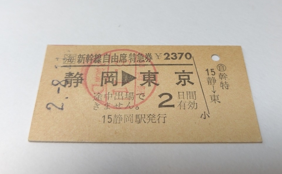 (95)JR東海 新幹線自由席特急券 静岡→東京 静岡駅発行(左下スジあり)