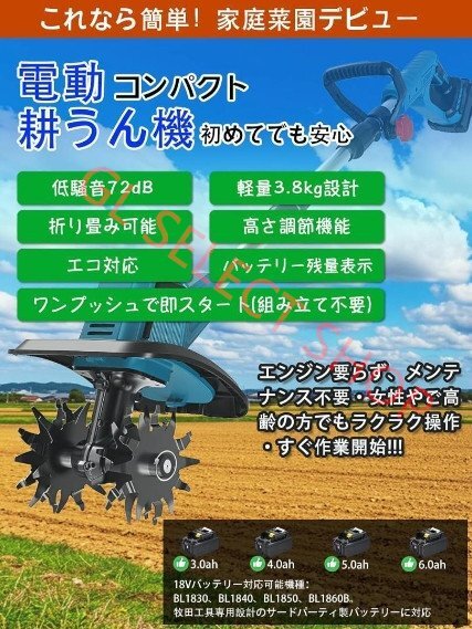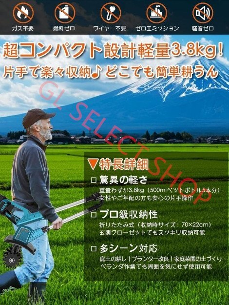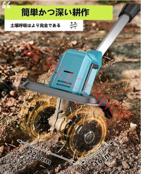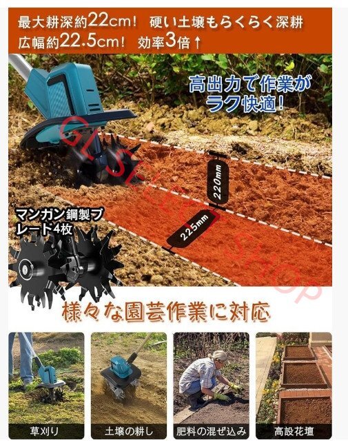 使いやすさに配慮した設計で、女性や田舎暮らしを始める定年後の方に最適。エンジン式よりも音や排気ガスが出ないので、住宅地の庭でも安心して使える。燃料やオイル交換不要でメンテ簡単。家庭菜園、農園、ビニールハウス、ガーデンなどで土を掘る作業に役立つ。電源がない場所や延長ケーブルが足りない現場でも便利。充電式なので、どこでも持ち運べます!