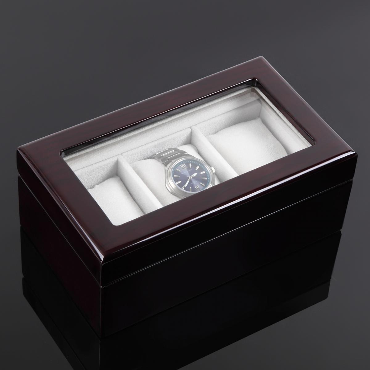 高級感と気品に溢れ、木製ならではの素材感をしっかり演出しており3本の腕時計が収納可能。繰り返し表面塗装を行い表面が非常に滑らかで深みのある「光沢」のある仕上がりです。 内装と時計のホルダーに手触りの良いベルベット素材を採用し収納スペースも広めに設計しておりますので時計もゆったり収まります。腕時計のプレゼントとあわせて収納ケースも是非プレゼントに!