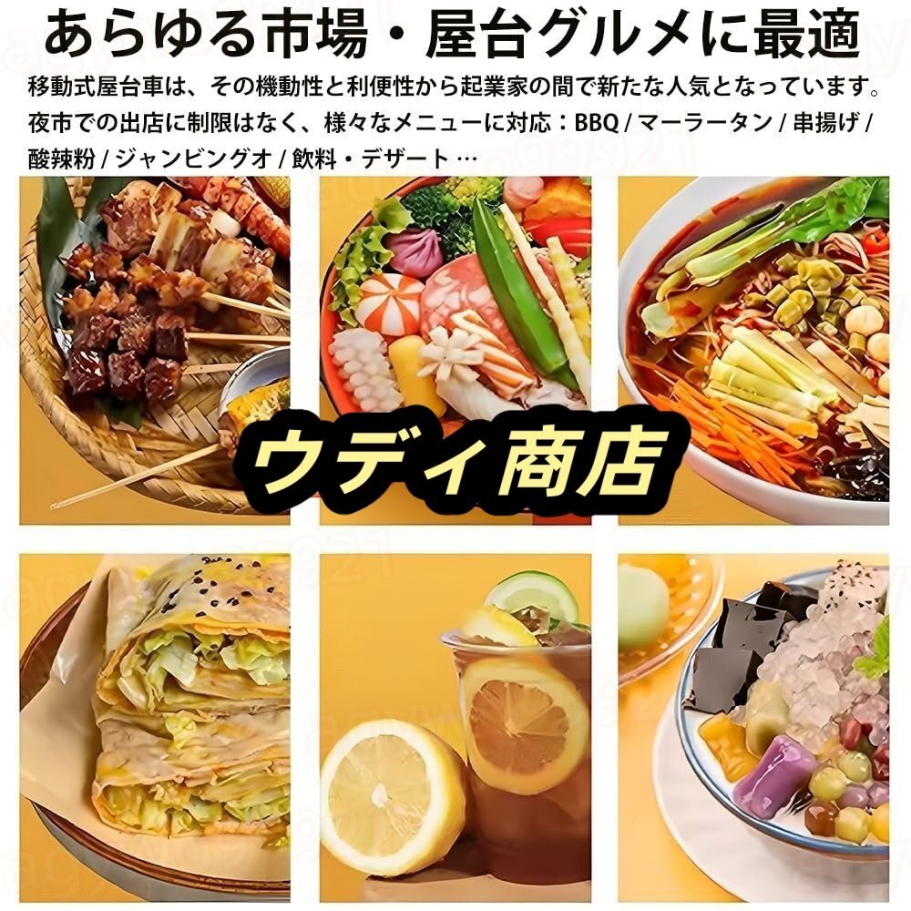 【幅広い用途】このフードトラックは滑らかな表面、大きなカウンタートップ、大きな収納スペースがあり、さまざまな屋台の食べ物、飲み物、アイスクリーム、その他のスナックに適しています。 ハンバーガー、タコス、ナチョスのドーナツ、スライスしたピザホットドッグなど。