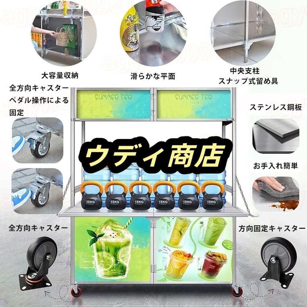 【製品の特徴】● 高耐久ステンレス製腐食に強く、屋外での長期間使用にも耐える頑丈なステンレス素材を採用。衛生的でお手入れ簡単。● 折り畳み式コンパクト設計使用後は簡単に折り畳めて省スペースで収納可能。軽量で持ち運びも楽々。車のトランクにも収納できます。● 移動・設置が簡単なキャスター付き360度回転する自在輪と固定キャスターを装備。安定した移動とストア配置が可能です。● 多機能&広々作業スペース調理、陳列、会計など屋台業務をまとめてこなせる広い天板。焼き鳥、たこ焼き、フランクフルト、かき氷、ドリンク販売など多様なメニューに対応。【こんなシーンに最適】フリーマーケット/縁日・祭り/朝市/ビアガーデン/キャンプ/バーベキュー/路上イベント出店/移動販売/季節のイベント出店イベントや路上販売に合わせたコンパクトで機動性の高い設計です。初心者からプロまで、さまざまな屋台ビジネスの強力なパートナーとなる一台です。