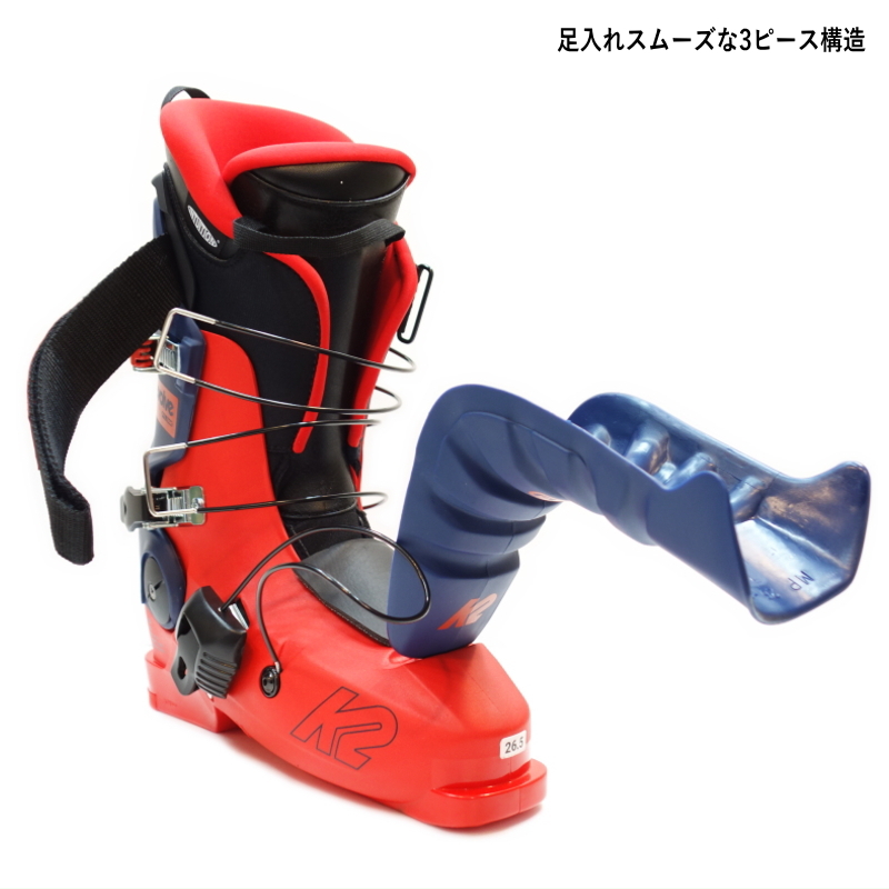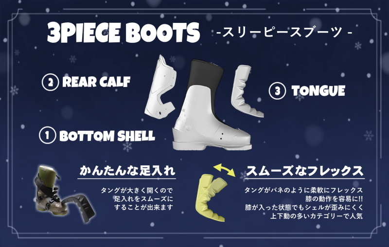 足入れのしやすい3PIECE構造。ぴったりとしたフィット感のミディアムラスト、足首を使いやすいミディアムソフトフレックスで快適なクルージングだけでなく、急斜面やリラックスした滑りまで幅広い滑りに対応するオールラウンドブーツです。タングによるフレキシブルなフレックスは足首の動きやすさに優れ、コブやフリースタイルに限らず幅広いジャンルの滑りに対応します。