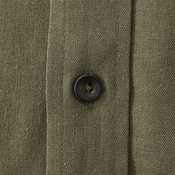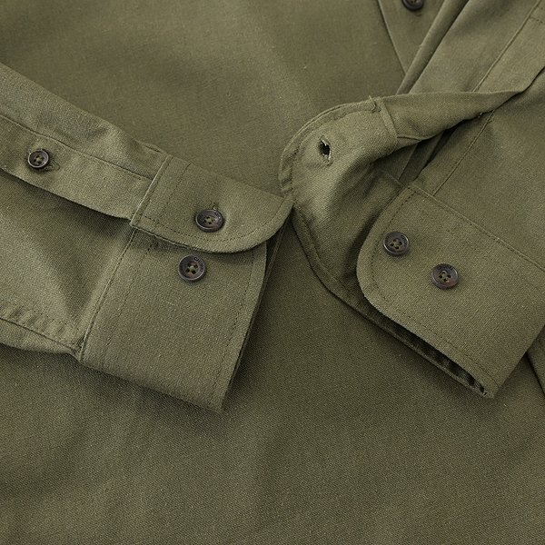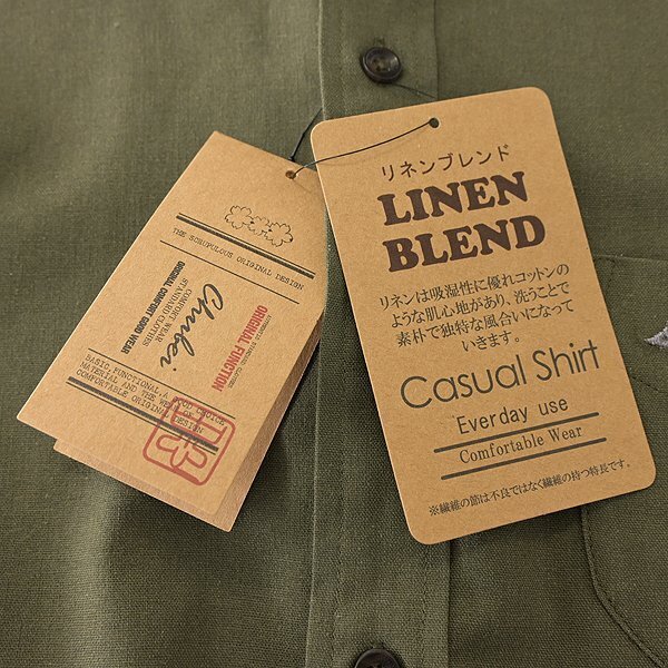| 新品 未使用 紙タグあり Mサイズ チェスト88~96 ※商品に記載されたサイズ・寸法です※ 首周り40cm 肩幅44cm 身幅52cm 袖丈59.5cm 着丈75.5cm 綿60% リネン20% ポリエステル20% カーキ |