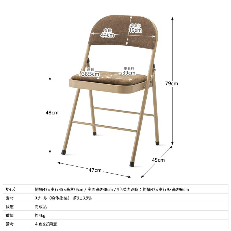 サイズ:約幅47×奥行き45×高さ79cm / 座面高さ:48cm / 折りたたみ時:約幅47×奥行9×高さ96cm