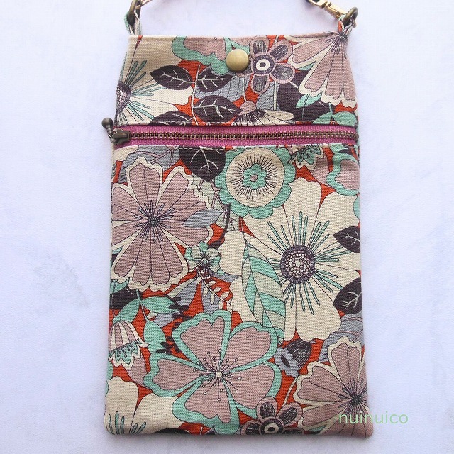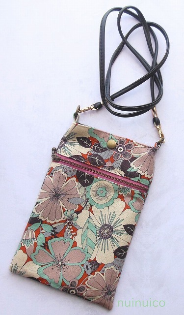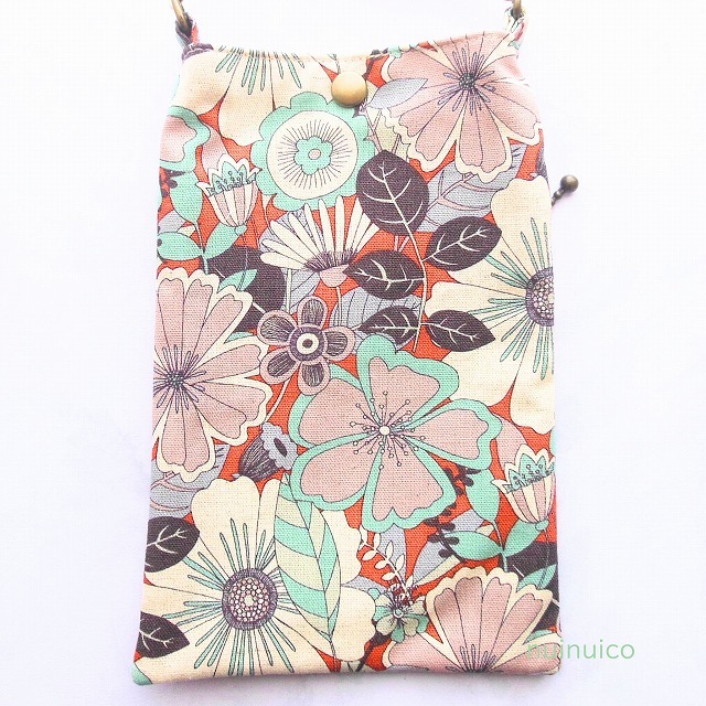 すてきな花柄生地で作ったスマホショルダーです。お散歩でも活躍してくれる大きさです。