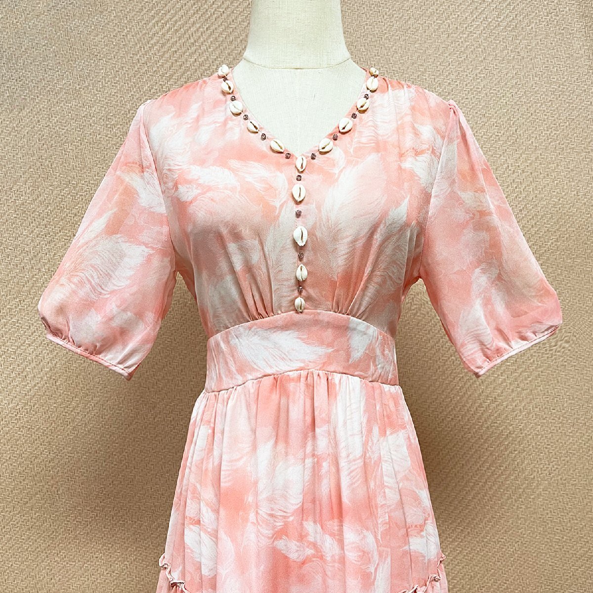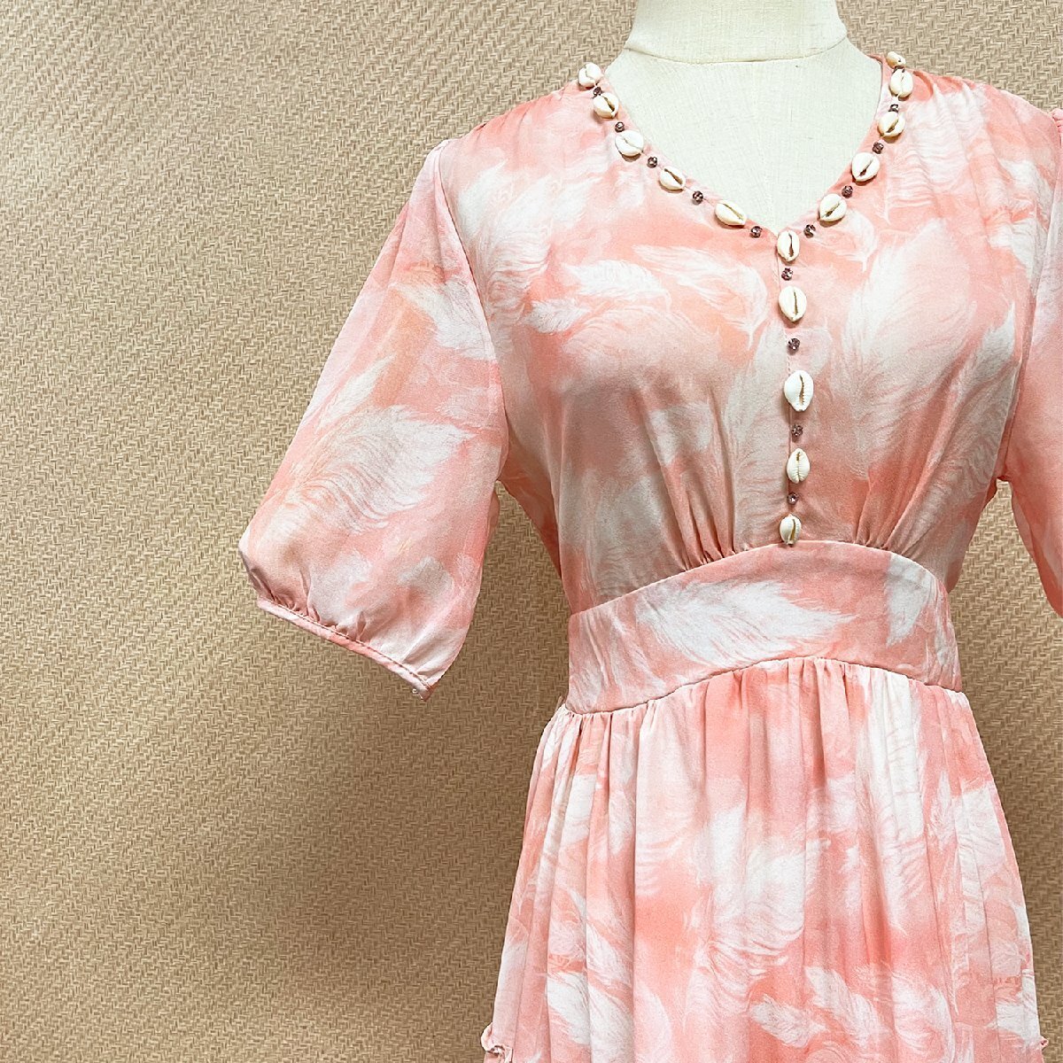 フロントには貝殻ビーズをあしらい、夏らしく爽やかでフェミニンな印象を演出します。細部に散りばめられたリーフ柄がオシャレ感満点のワンピースドレスです。Vネックでデコルテを綺麗に見せ、エレガントな雰囲気を演出します。ハイウエストデザインで脚長効果があり、シルエットもすっきりと美しく見せてくれます。