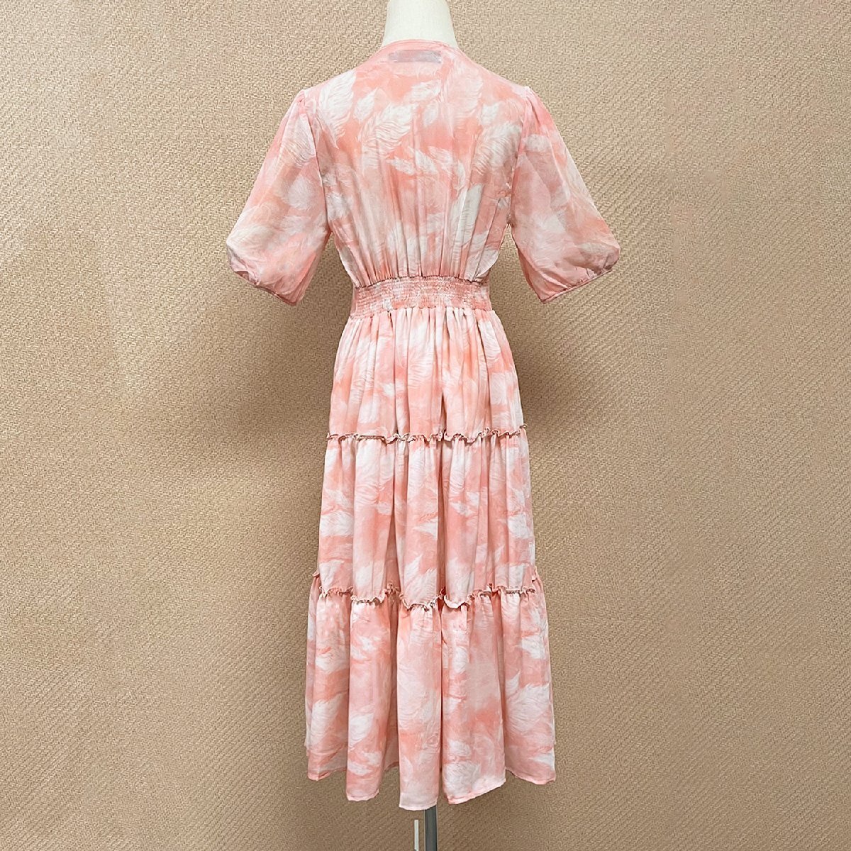 人気ヨーロッパ製※定価5万◆ブルガリア発※RISELIN ワンピース シルク混 通気 総柄 リーフ柄 Vネック 貝殻 可愛い レディース 夏 L/48