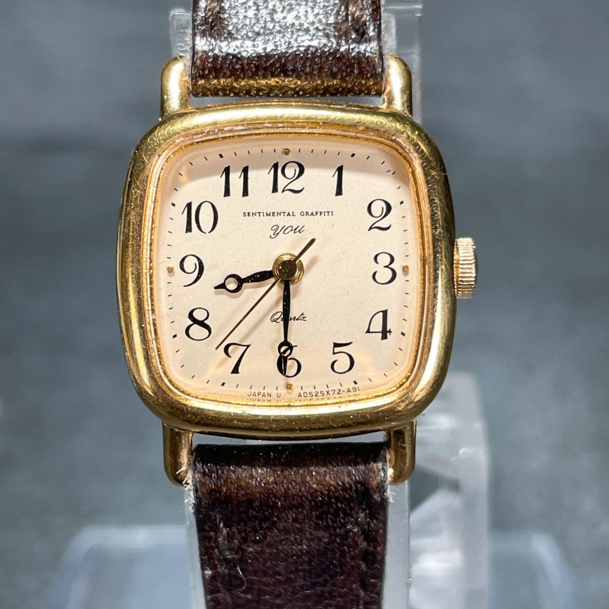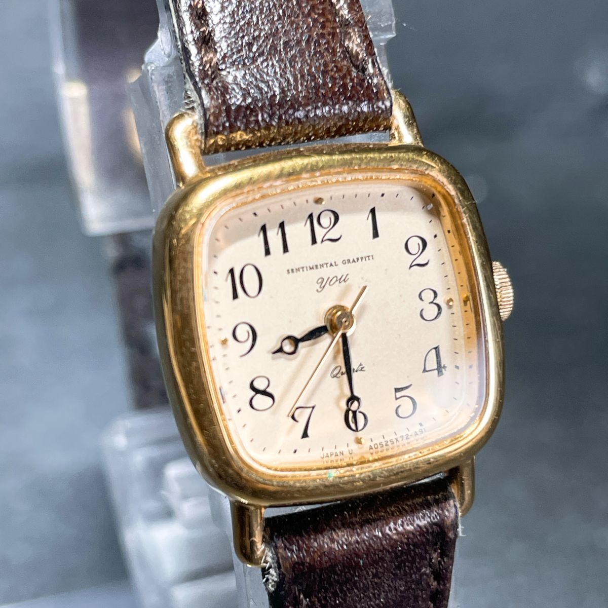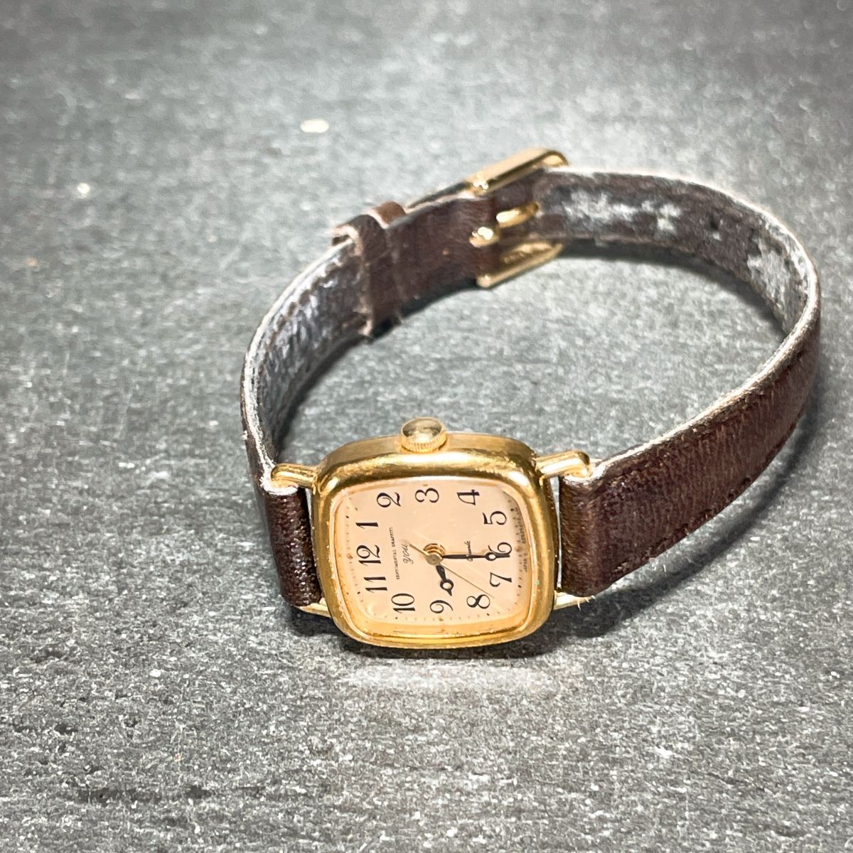 美品 ORIENT オリエント you A055X7-20 腕時計 アナログ クオーツ 3針 ゴールド文字盤 スクエア レザーバンド ブラック ステンレススチール