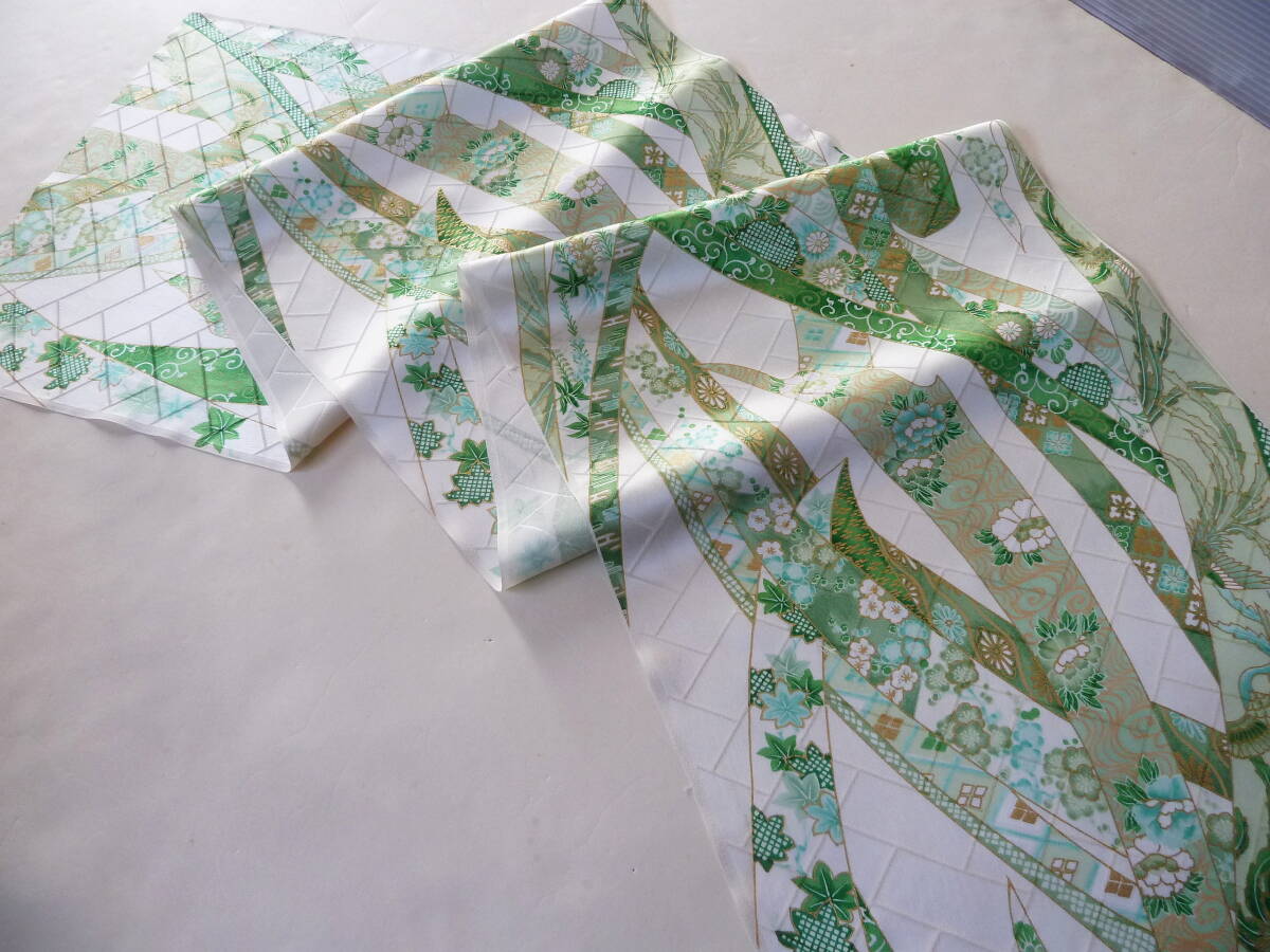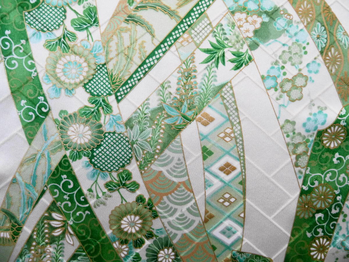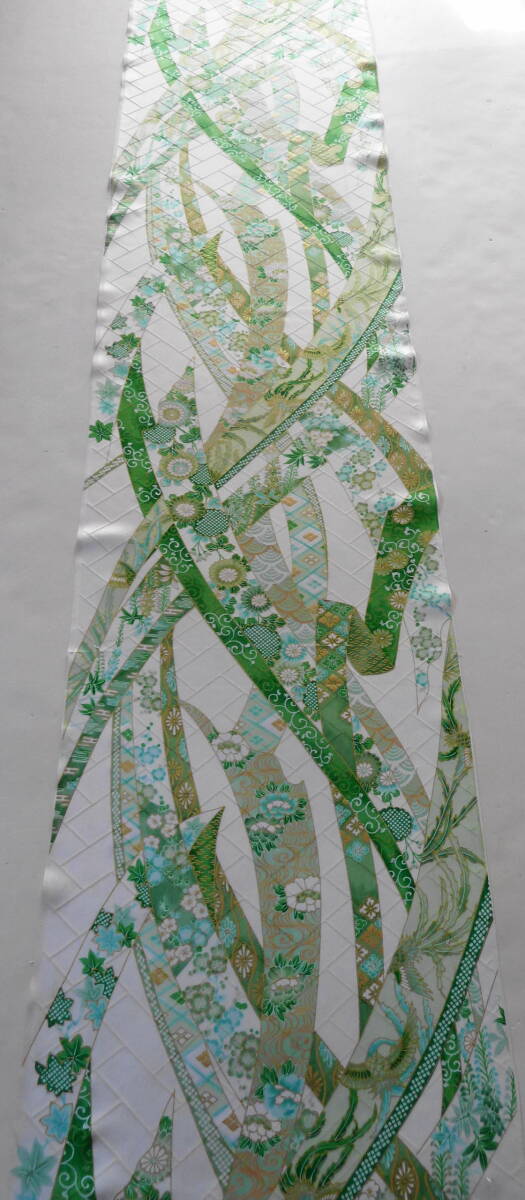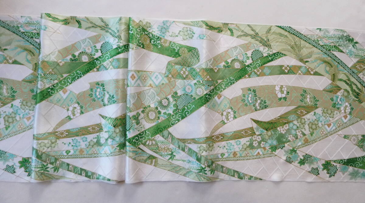 ■彩■古布着物はぎれ/ハギレ 37×173 正絹 紋綸子 緑色系の蔓帯模様 桧垣地紋 振袖