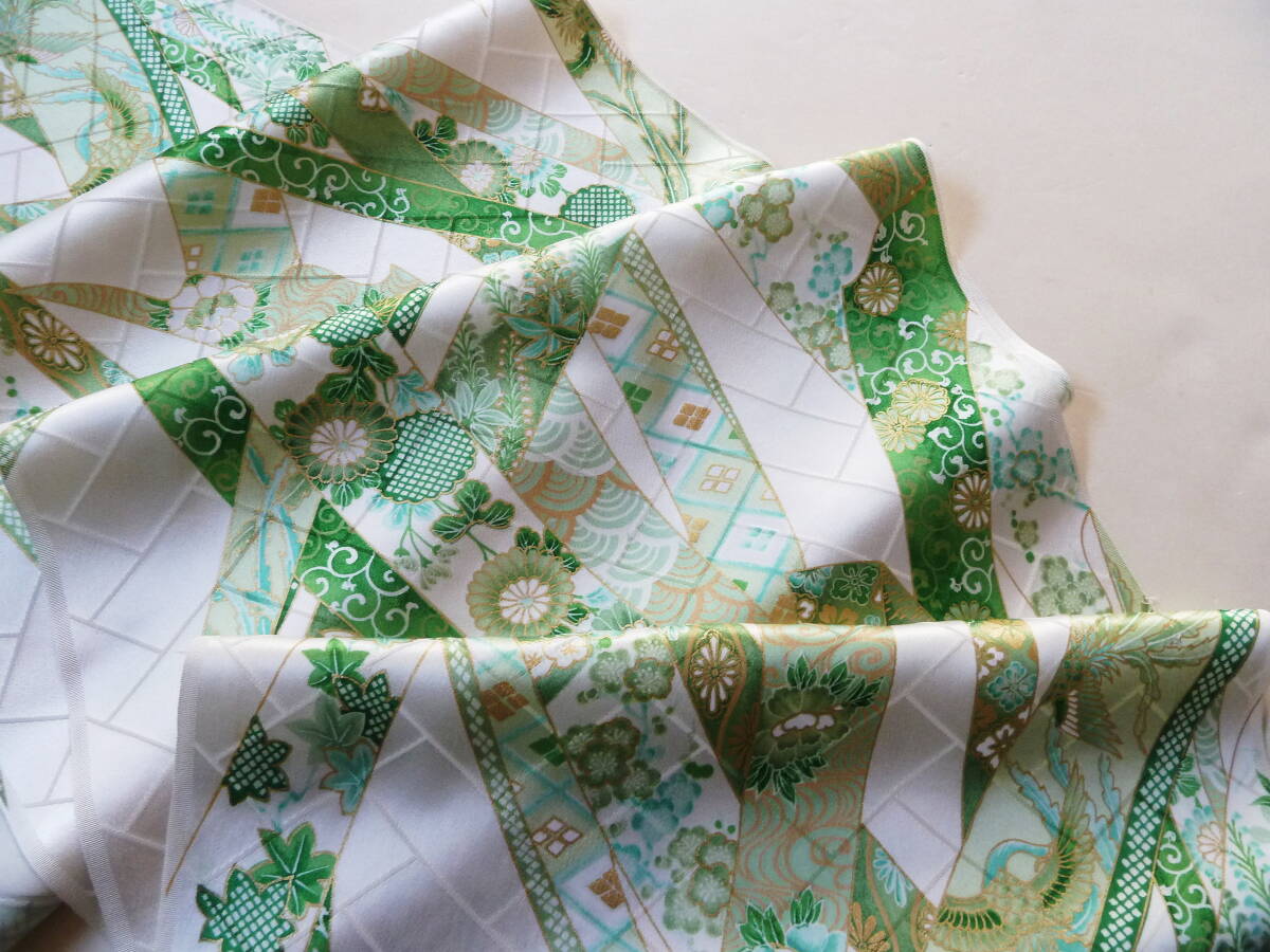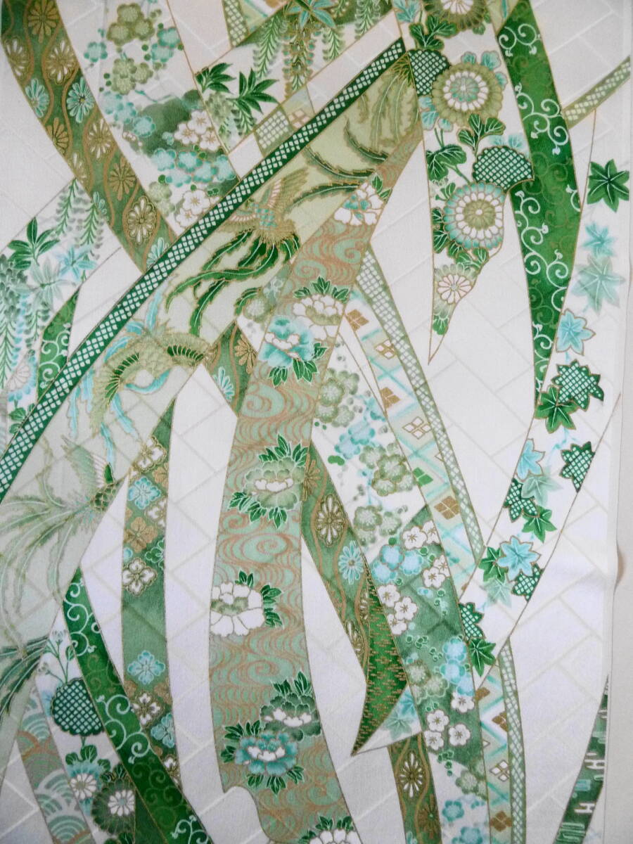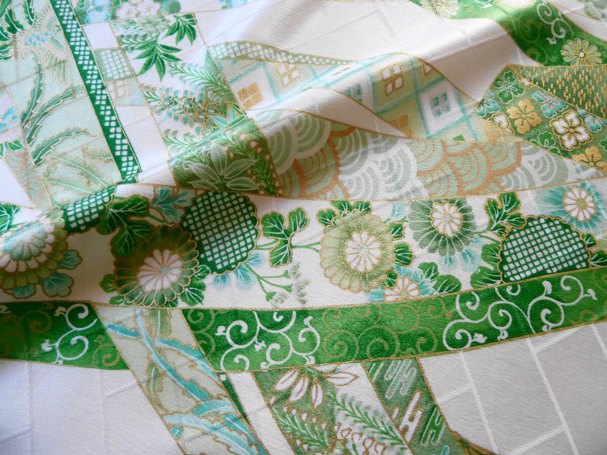■彩■古布着物はぎれ/ハギレ 37×173 正絹 紋綸子 緑色系の蔓帯模様 桧垣地紋 振袖