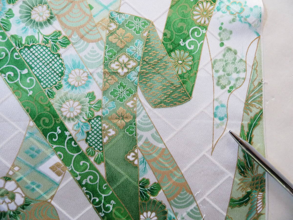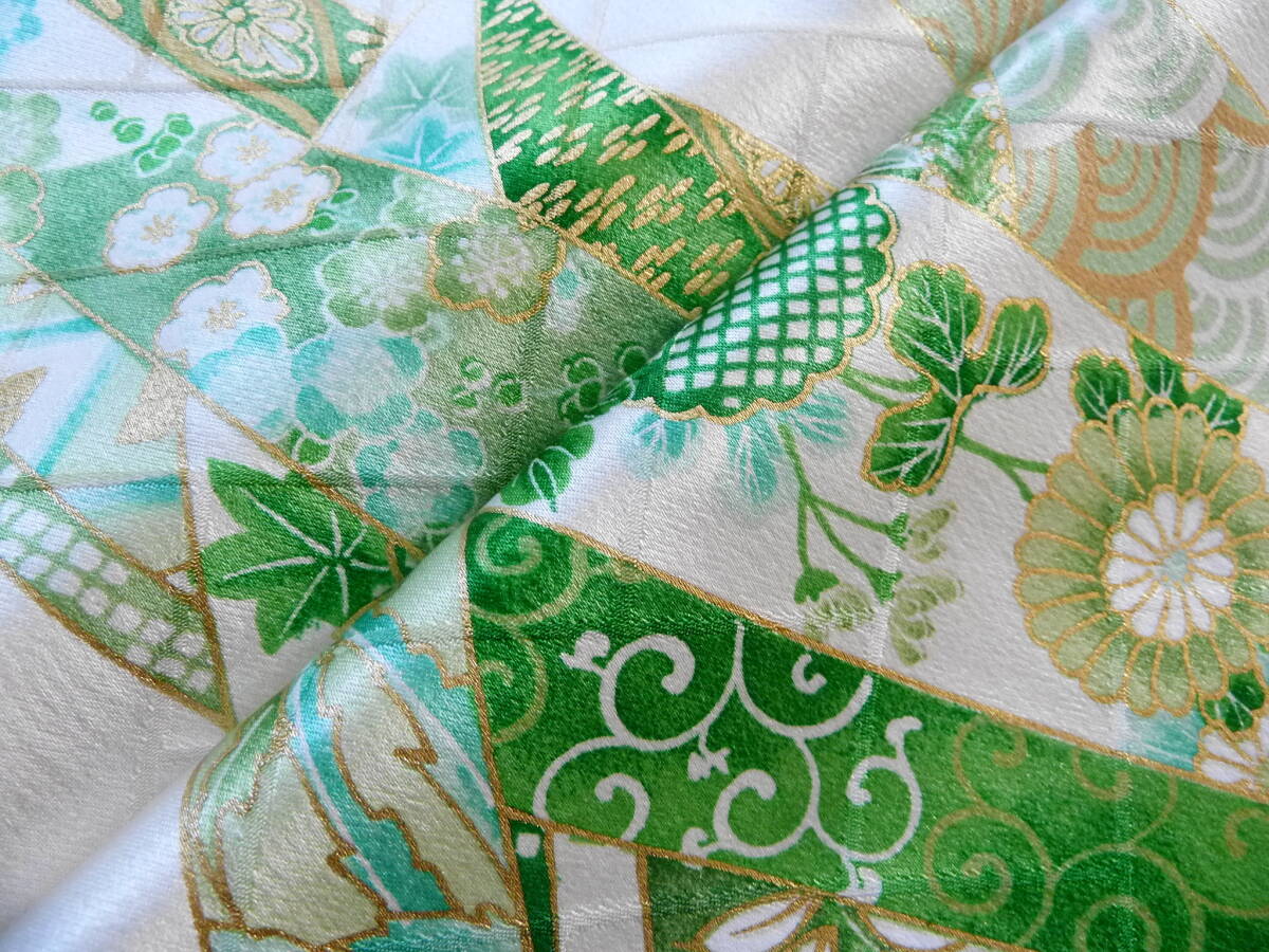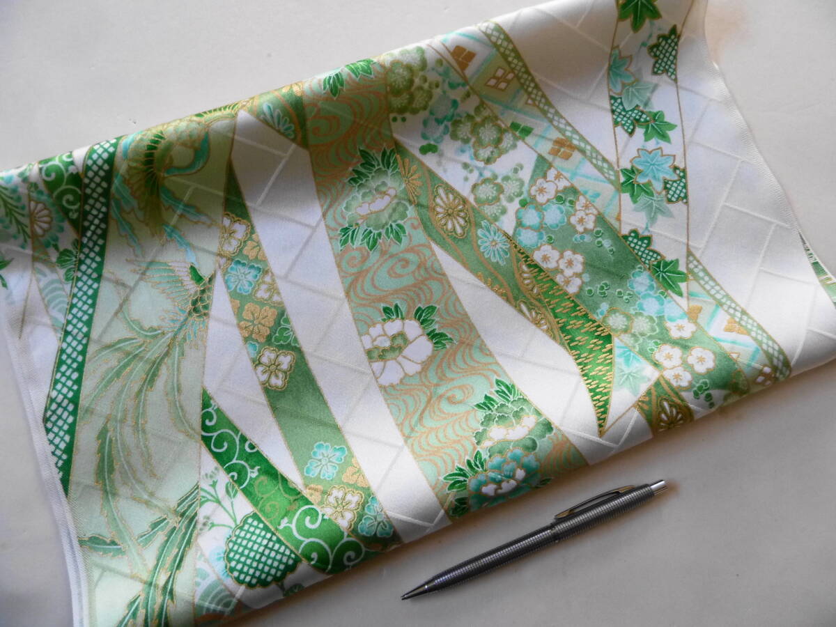■彩■古布着物はぎれ/ハギレ 37×173 正絹 紋綸子 緑色系の蔓帯模様 桧垣地紋 振袖 シルク お人形 布細工