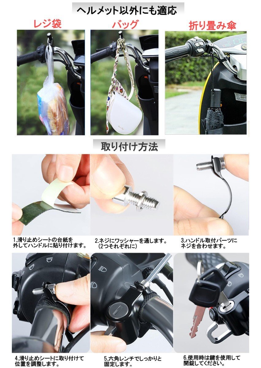 ヘルメットのほか、バッグ、レジ袋、折りたたみ傘などを掛けることができます。