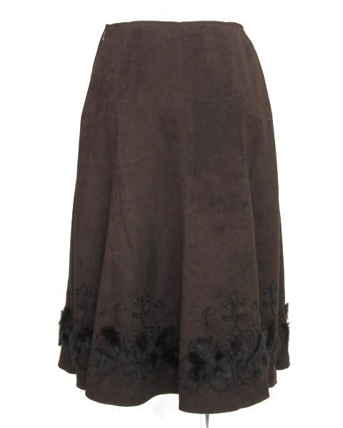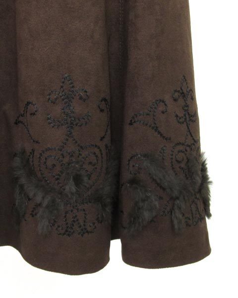 | 大人女性のフェイクスウェードフレアスカート♪なめらかなフェイクスエード素材の季節感のあるオシャレなスカートです。スカート下部分の刺繍とファーがアクセントとなっています。フレアシルエットが女性らしく、大人っぽく決まりますよ。 |