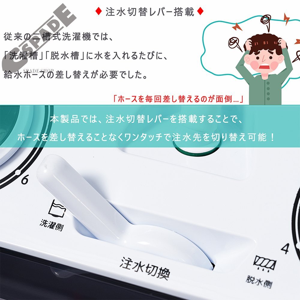 • ◎04注水切替レバー搭載従来の二槽式洗濯機では、「洗濯槽」「脱水槽」に水を入れるたびに、給水ホースの差し替えが必要でした。本製品では、注水切替レバーを搭載することで、ホースを差し替えることなくワンタッチで注水先を切り替え可能!ご注意ください!(※必ずお読みください)①脱水槽は排水口と直結しているため、注水するとそのまま排水されます。 → 注水時は排水ホースを高い位置に上げるか、排水バケツにセットしてください。②脱水中の注水は危険です!→ 必ず「脱水が始まる前」に注水を完了させてください。→ 脱水が回転中の状態で注水すると、水が飛び散ったり、機械の誤作動・故障につながる恐れがあります。③脱水時のご注意:押さえ蓋は必ず平らに設置してください。フタが斜めになっていると、高速回転時にガタつきや異音の原因になります。