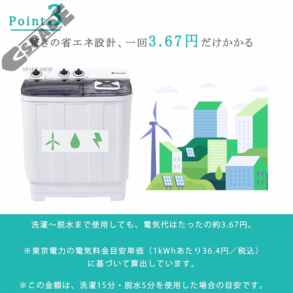 • ◎06驚きの省エネ設計、一回3.67円だけかかる 洗濯~脱水まで使用しても、電気代はたったの約3.67円。※この金額は、洗濯15分・脱水5分を使用した場合の目安です。※東京電力の電気料金目安単価(1kWhあたり36.4円/税込)に基づいて算出しています。