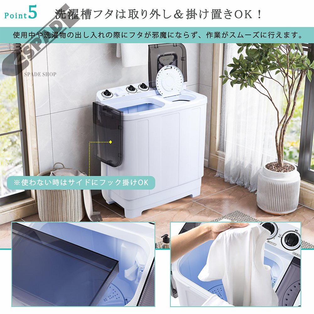 • ◎02 洗濯物をしっかり洗って、しっかり脱水!洗濯槽と脱水槽が分かれている二槽式タイプ 汚れをしっかり落としながら、効率的に洗濯できます。洗濯容量はたっぷり7kg。家族の毎日の洗濯物や、シーツ・タオルなどの大物洗いにも対応可能です。脱水容量も4.5kgとパワフルで、洗濯後すぐに干せる状態まで水気を飛ばします。使用シーン:朝の時短洗濯に → 洗いながら脱水で効率UP赤ちゃんの衣類専用洗い機として泥汚れや作業着用のセカンド洗濯機として