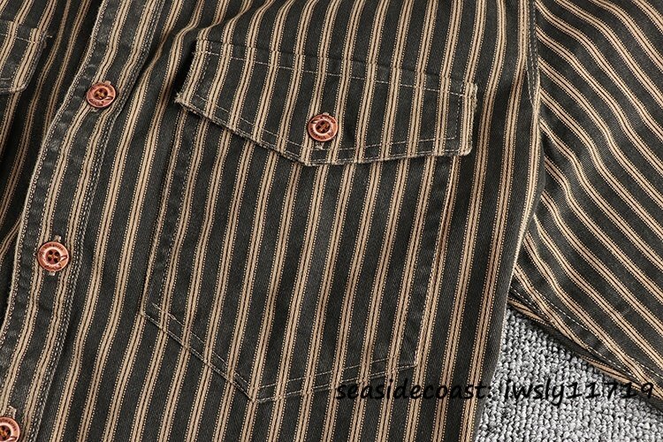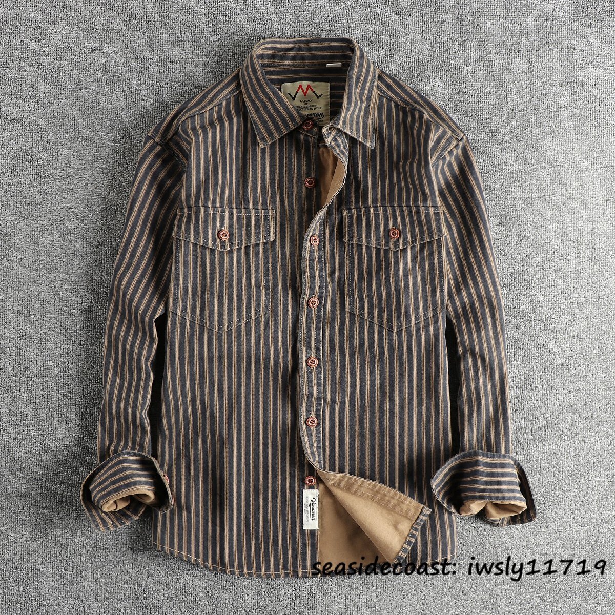 新品■メンズ 長袖シャツ ワークシャツ ストライプ柄 厚手 秋冬 ミリタリー 防風 ビンテージ アメリカン ワッシャー 心地良し ブルー 3XL