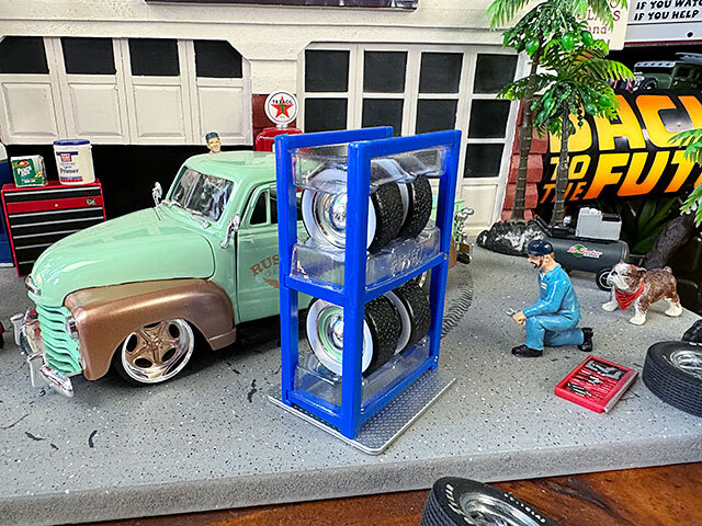 今回のはタイヤ&ホイールと、それを保管しておくタイヤラックがオマケで付いてくるシリーズなので、ホイールを交換して足元の変化を楽しめるようになってます。