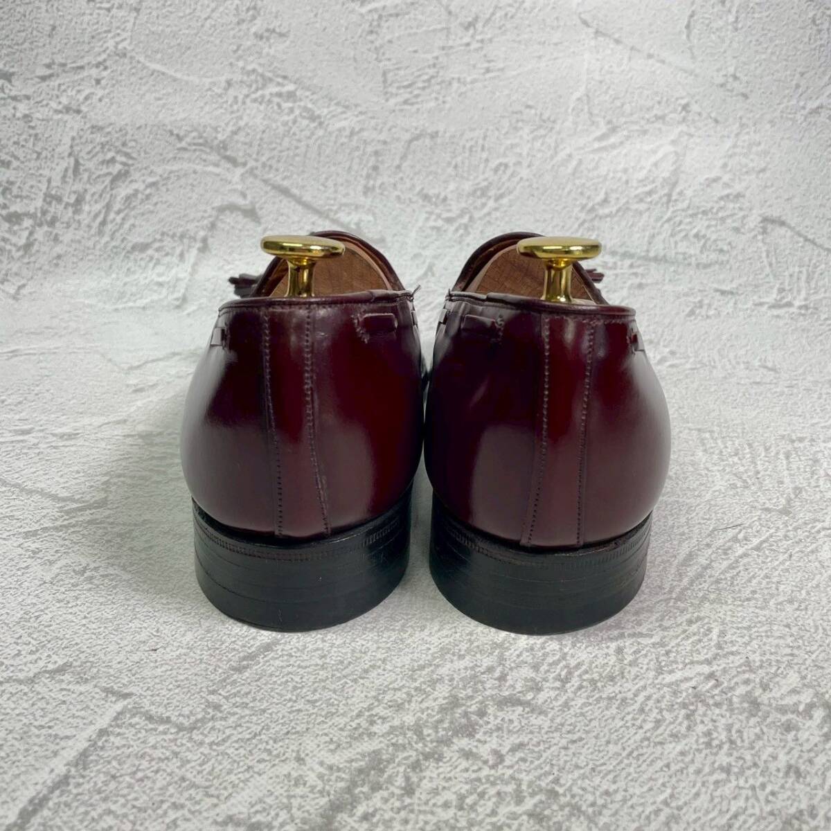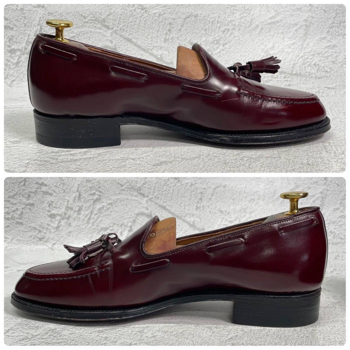 名門チャーチが手掛けた「KEETS」は、旧3都市表記時代に製造されたヴィンテージタッセルローファー。艶やかなポリッシュドバインダーカーフに、エイジングによる深みのあるバーガンディ。左足トゥにスレはあるものの、古靴らしい味わい。現代のスタイルとも自然に馴染む、上質な一足です。