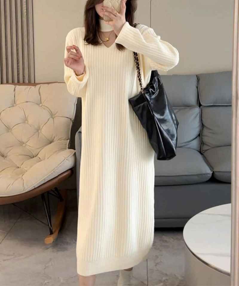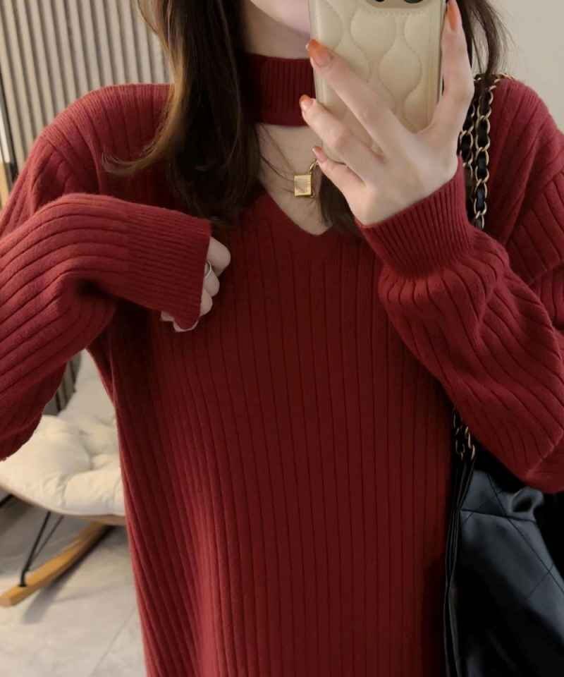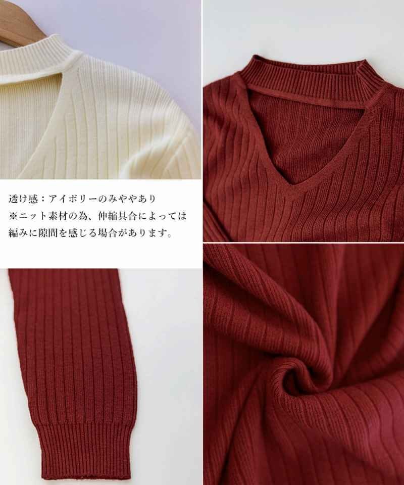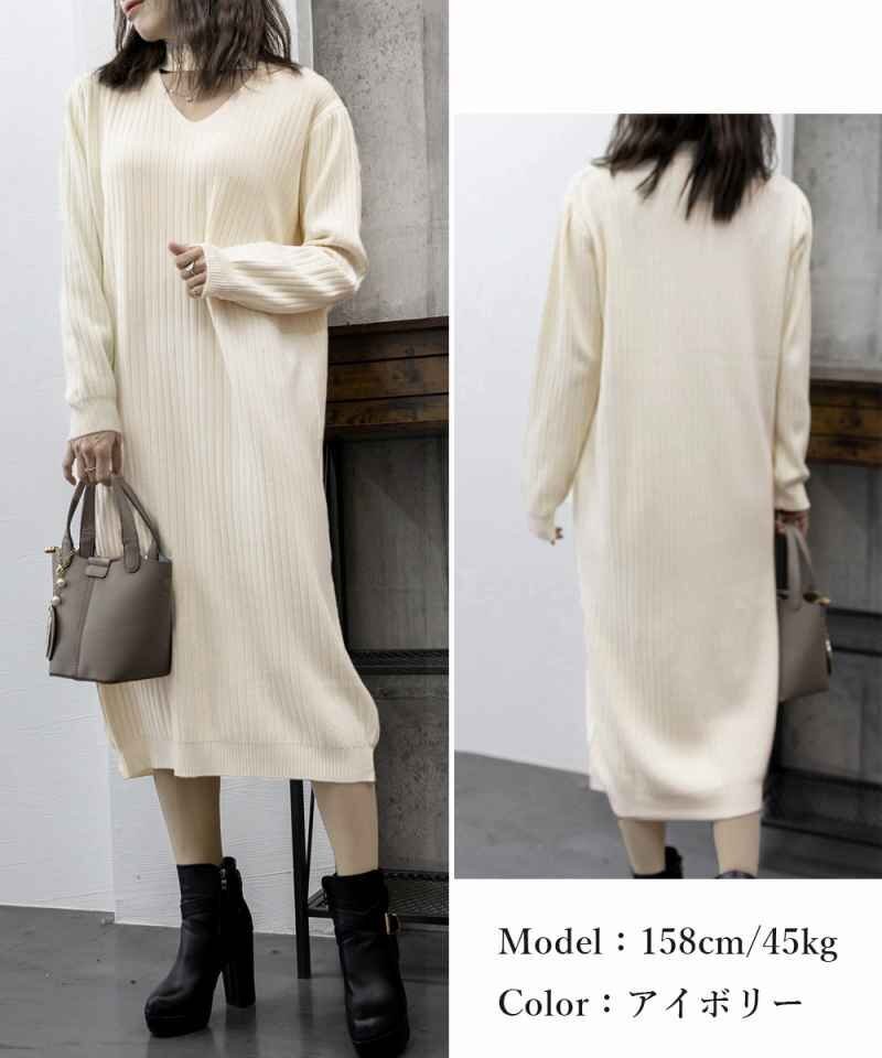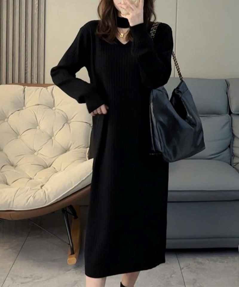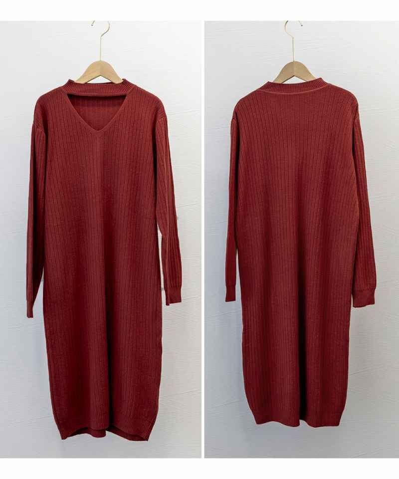 Vネックにチョーカーデザインを加え、デコルテを美しく魅せたニットワンピースです。
