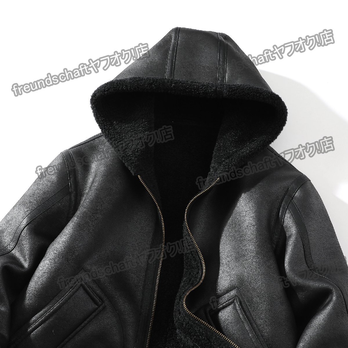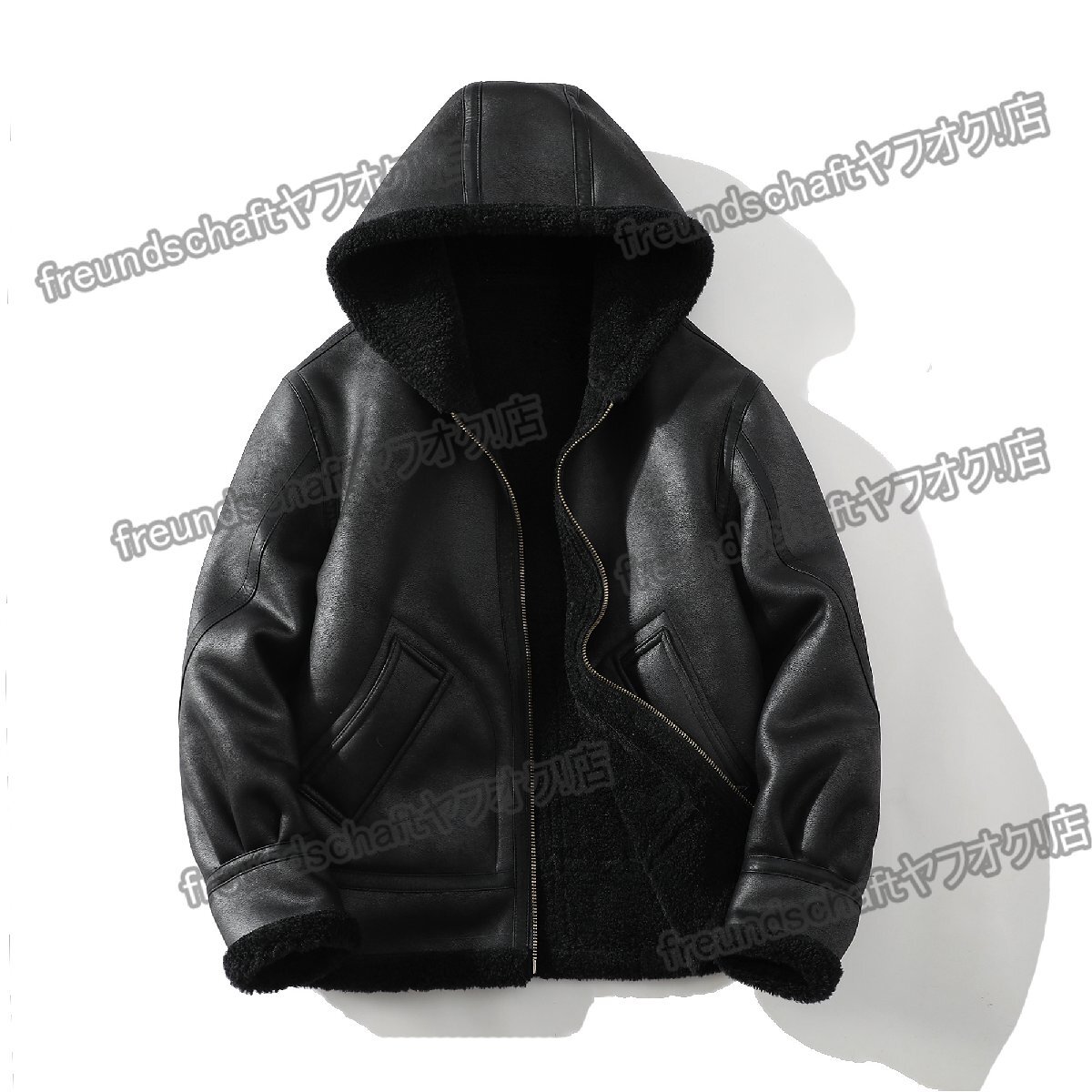 ジャケット 高品質 厚手 ソフト 裏起毛 フード付き ゆったり 無地 ライダース レザージャケット アウター 秋冬 メンズ SIZE:XL zcfz05.bk.3