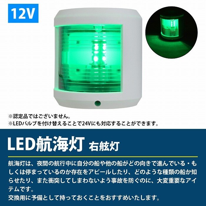 【送料無料】LED 航海灯 右舷灯 緑灯/右側 青信号 第二種舷灯 12V ボディカラー/ホワイト 白 ボート 船 船舶 ヨット (バルブ交換24V対応)