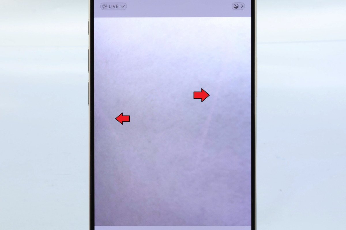 ■特記事項 : インカメラ撮影時、写真ともに縦に光のラインが写り込みます(写真6 ※インカメラで撮影した写真を撮影してます) 画面キズ(写真7)