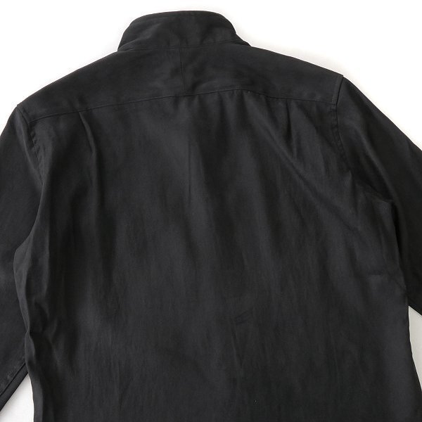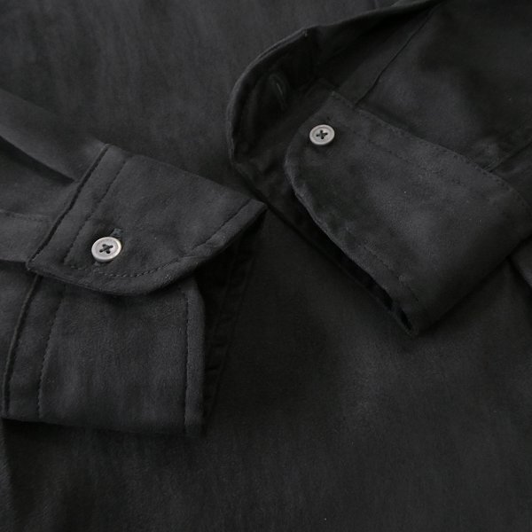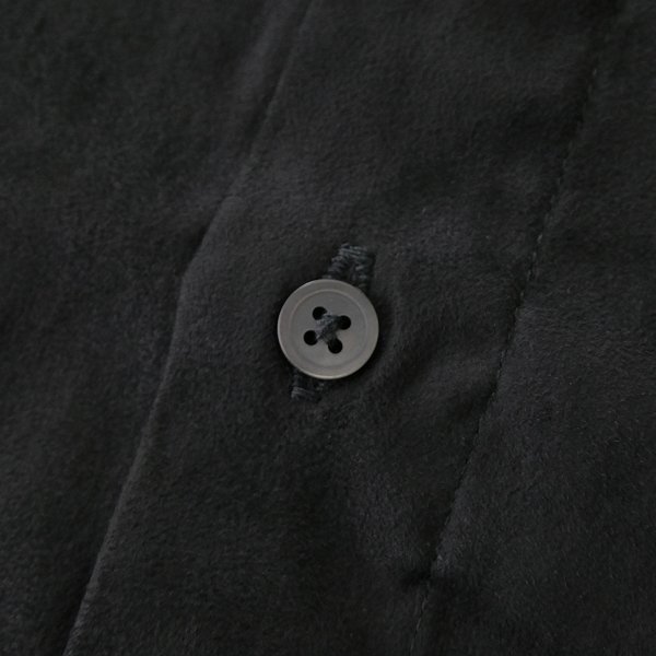 化学メーカー大手クラレ社製のヌバック調素材を使用した1枚。 独特のドレープ感と、ソフトで軽やかな着心地が魅力です。 デザインは、アウターとしての要素も兼ね備えたスタンドカラーシャツ。 通常のシャツより着丈を約3cm短めに設定することで、羽織りとしての雰囲気を強調しました。 襟にはプラスチックワイヤーを内蔵し、美しい襟立ちを自在に演出できます。 シャツの軽やかさとアウターの存在感を併せ持つ、シーズンを通して活躍するアイテムです。 |