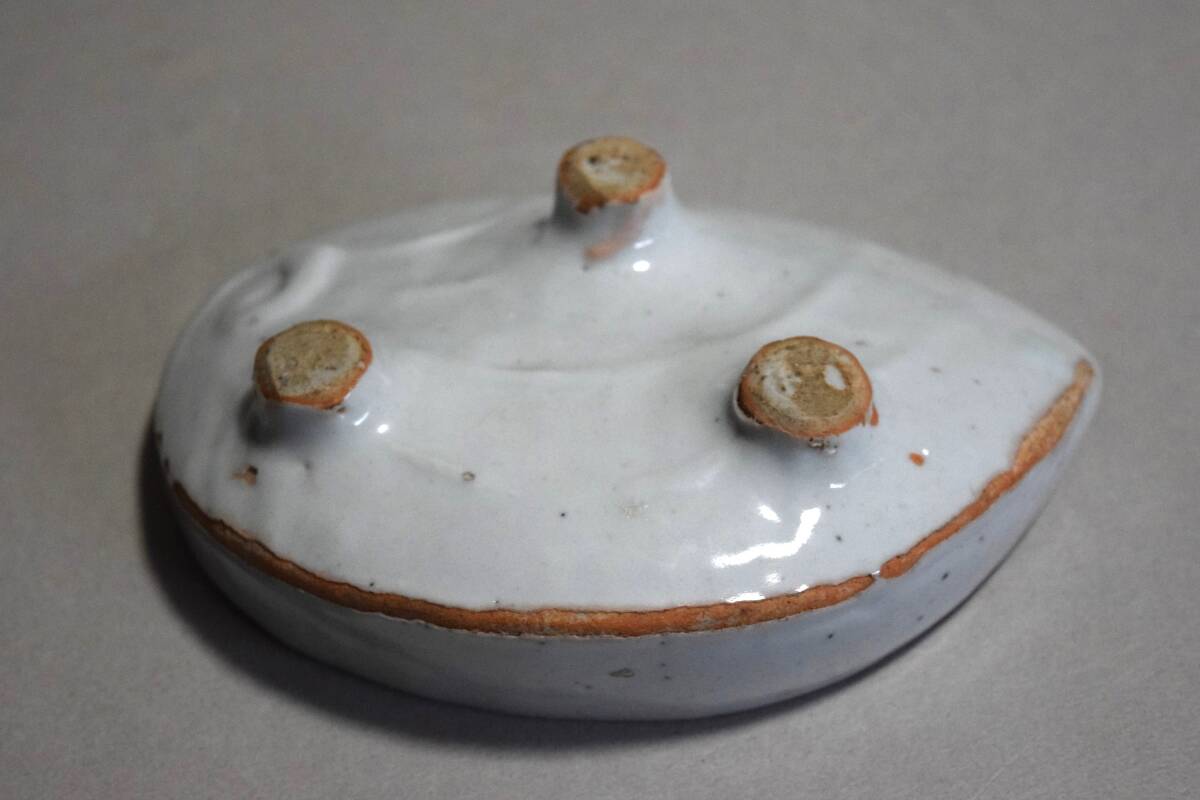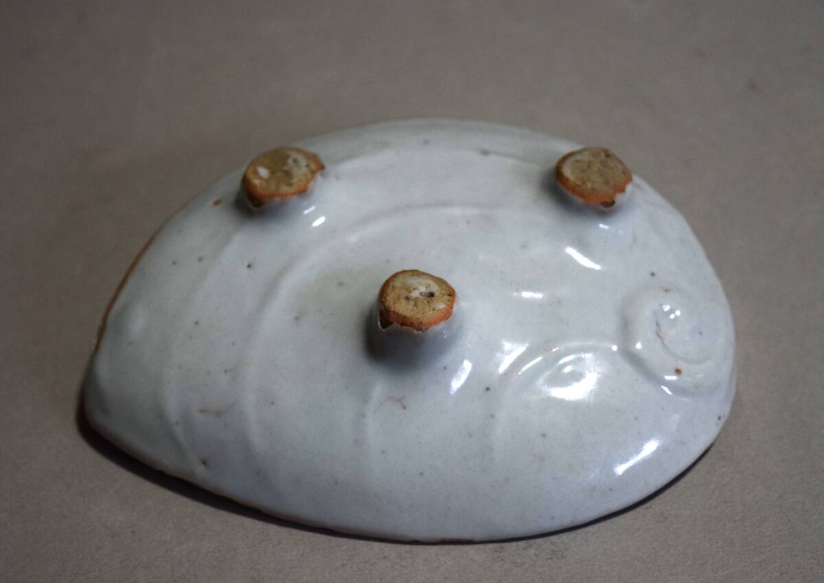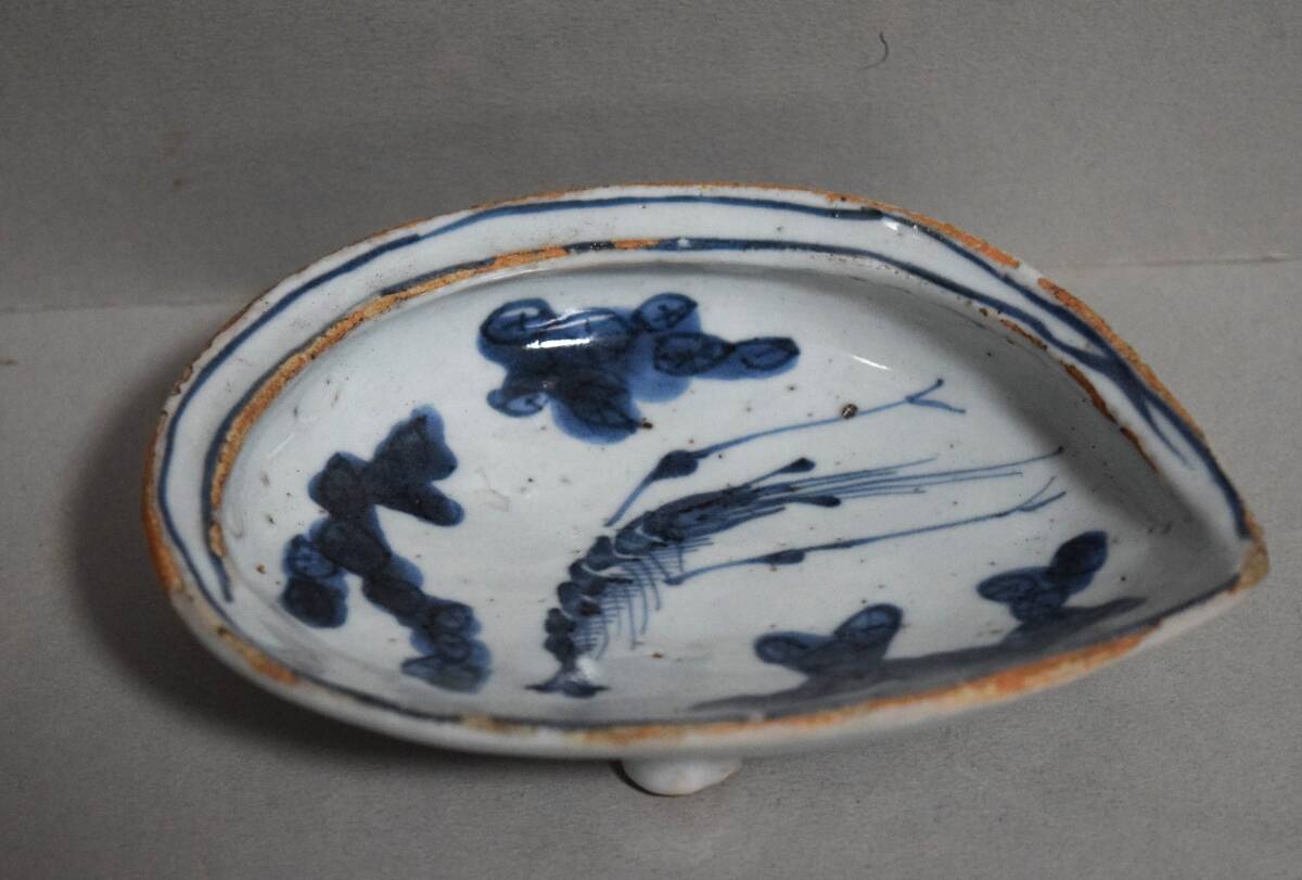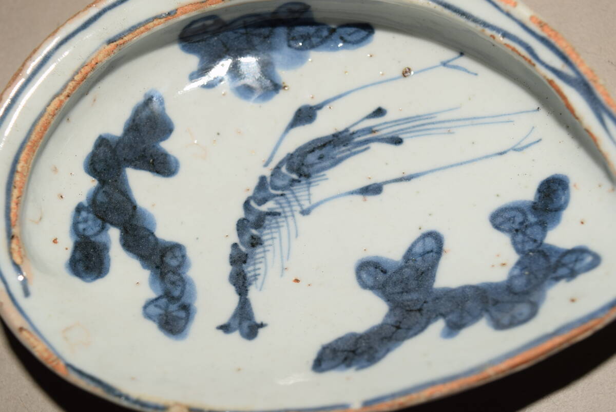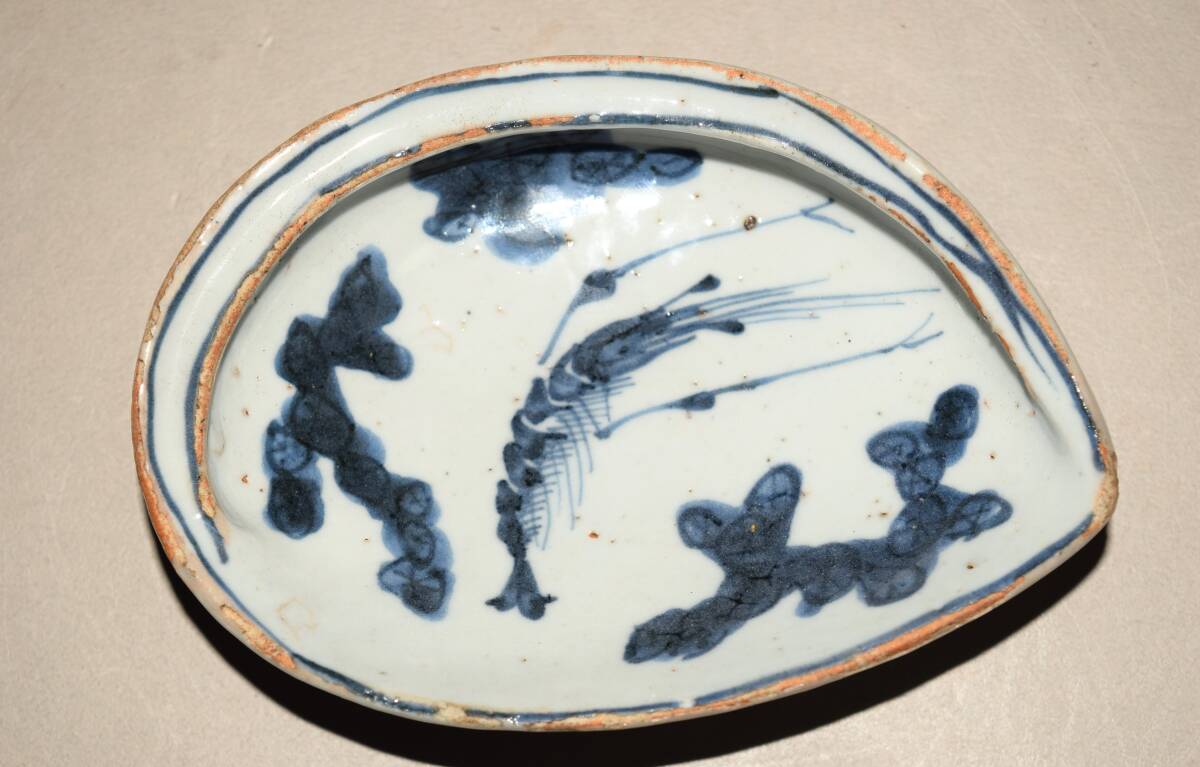 アワビの形を陽刻のように裏表凝った造りにしていて、表面に海老の染付文を描いています。